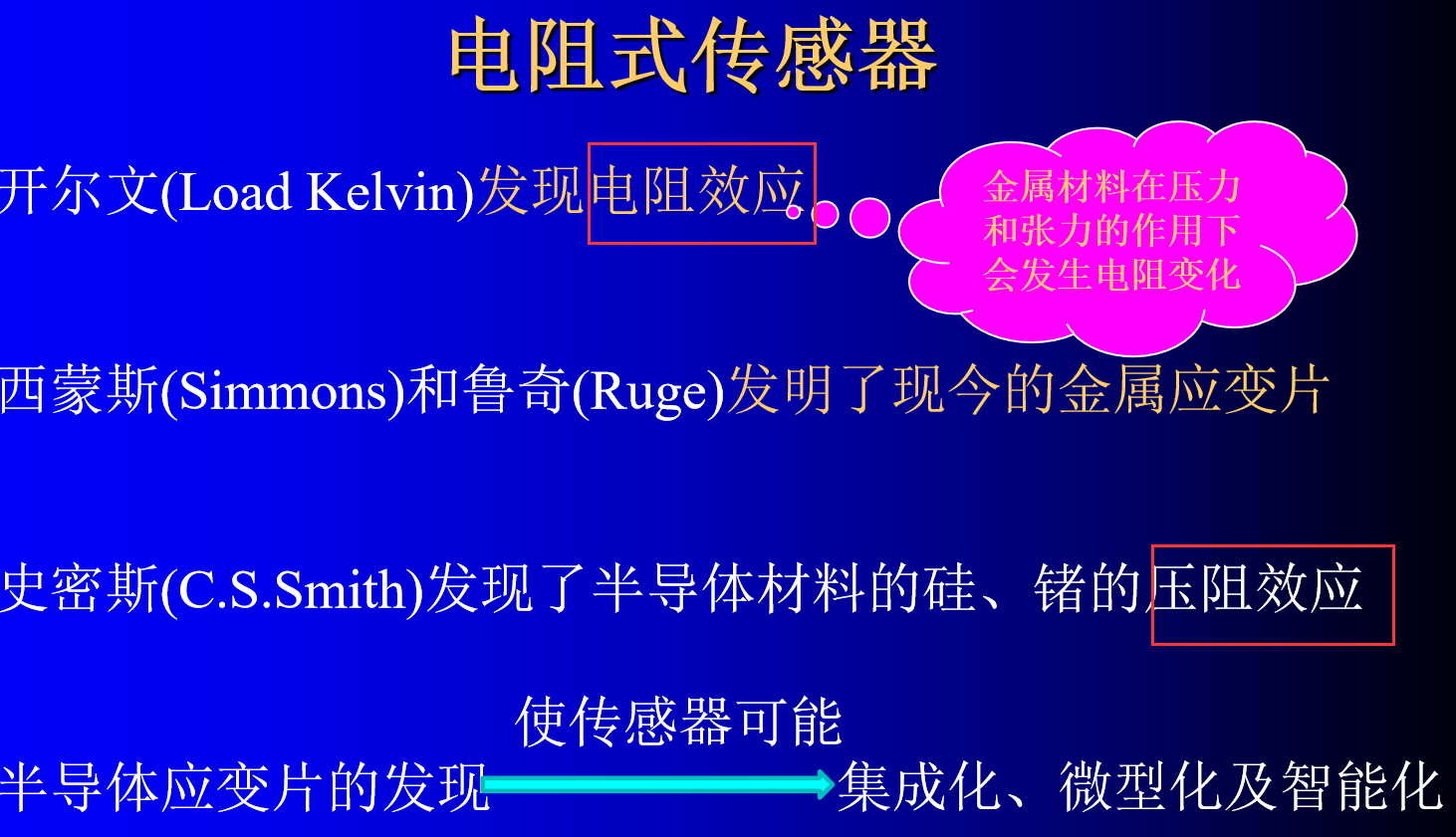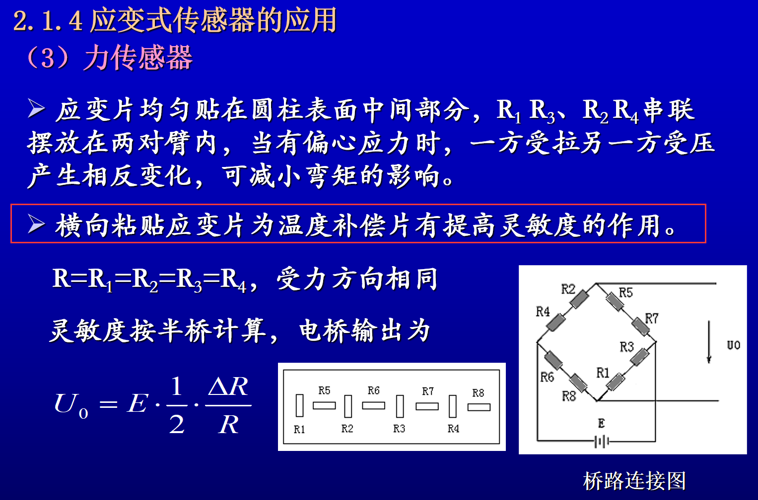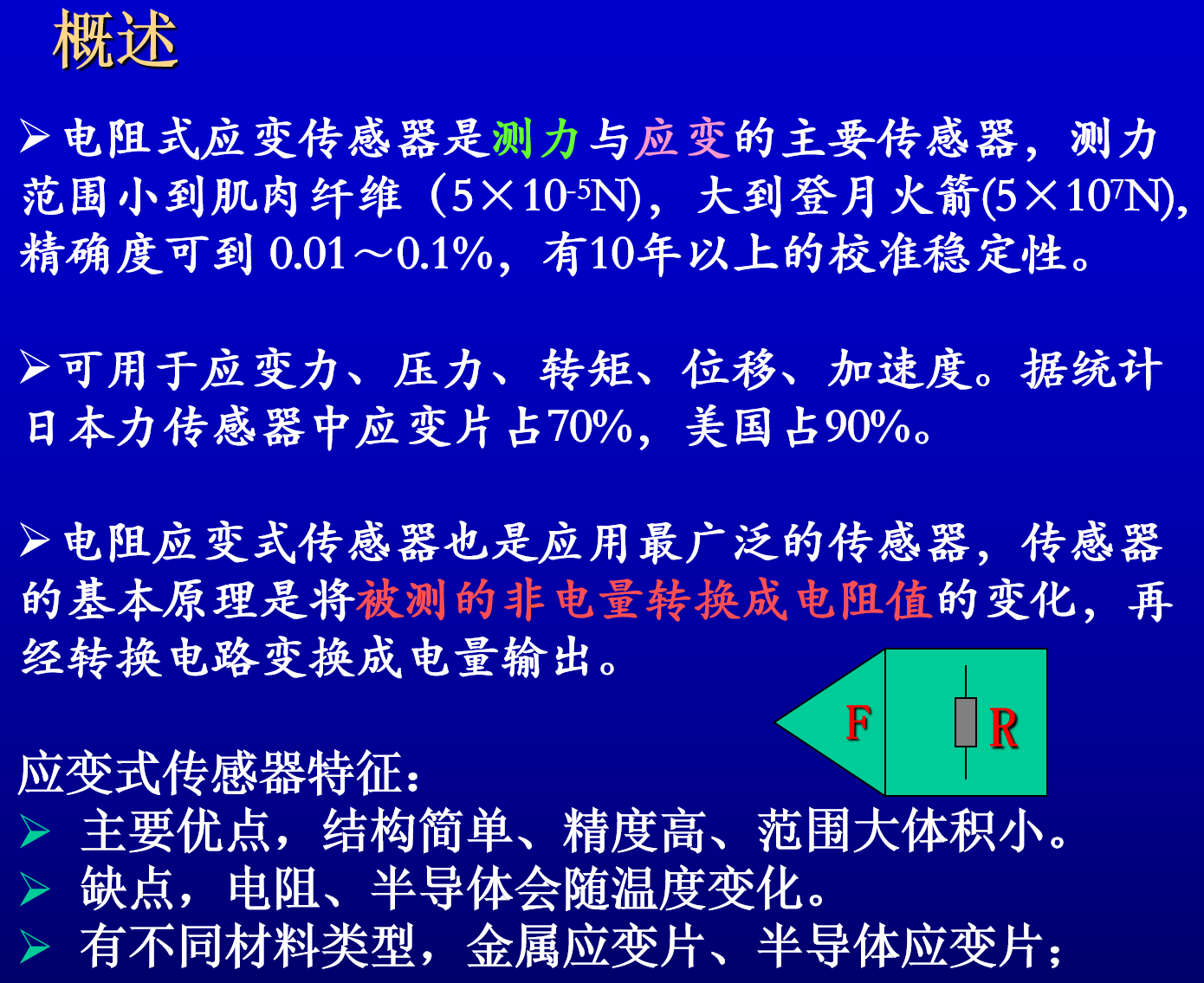 电阻应变式传感器具有悠久的历史。由于它具有结构简单、体积小、使用方便、性能稳定、可靠、灵敏度高、动态响应快、适合静态及动态测量、测量精度高等诸多优点,因此是目前应用最广泛的传感器之一。