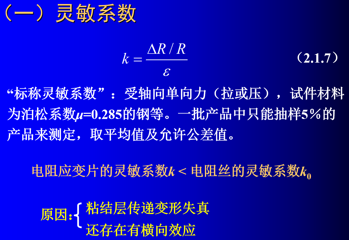 电阻应变片的灵敏系数K是通过抽样测定得到的,产品包装上标明的“标称灵敏系数”是出厂时测定的该批产品的平均灵敏系数。