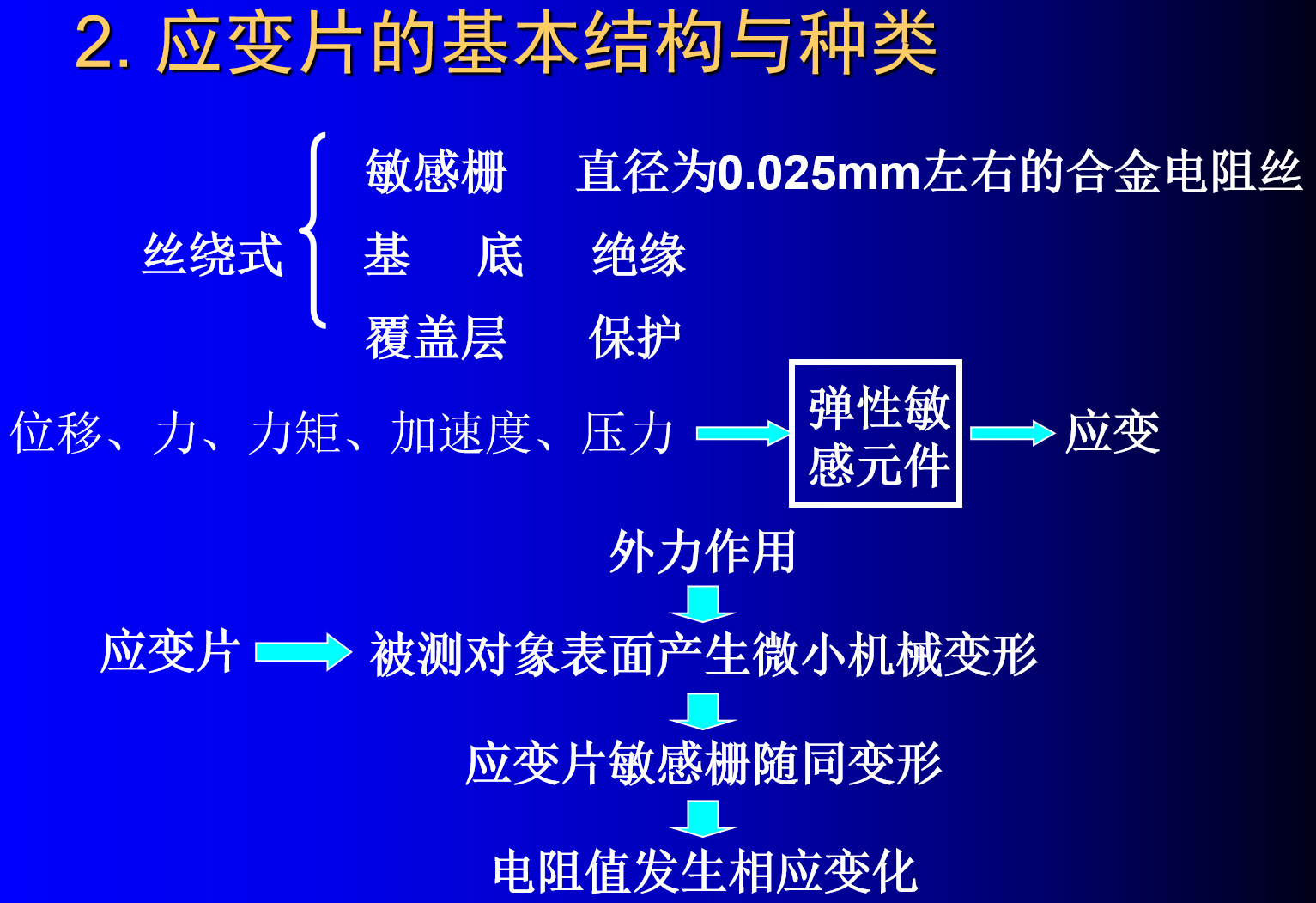 - 当弹性元件感受被测物理量时,其表面产生应变,粘贴在弹性元件表面的电阻应变片的电阻值将随着弹性元件的应变而相应变化。