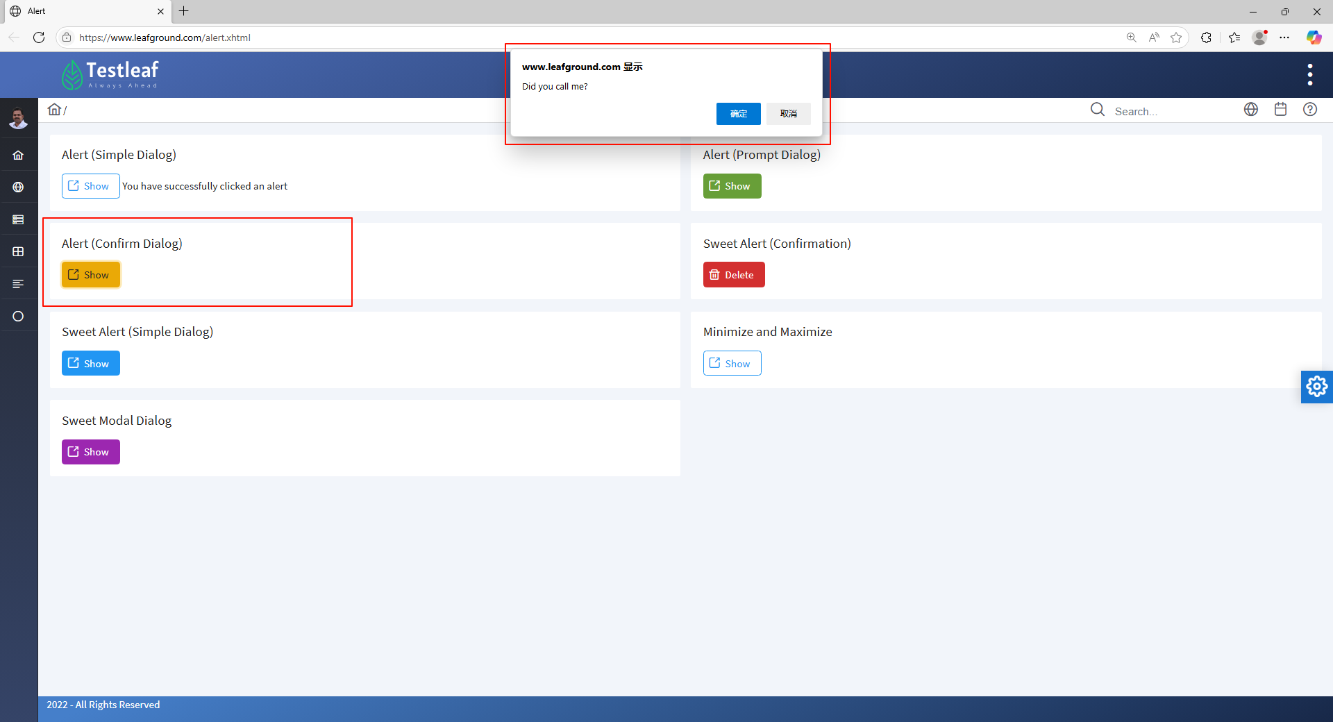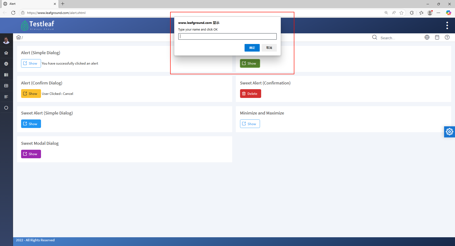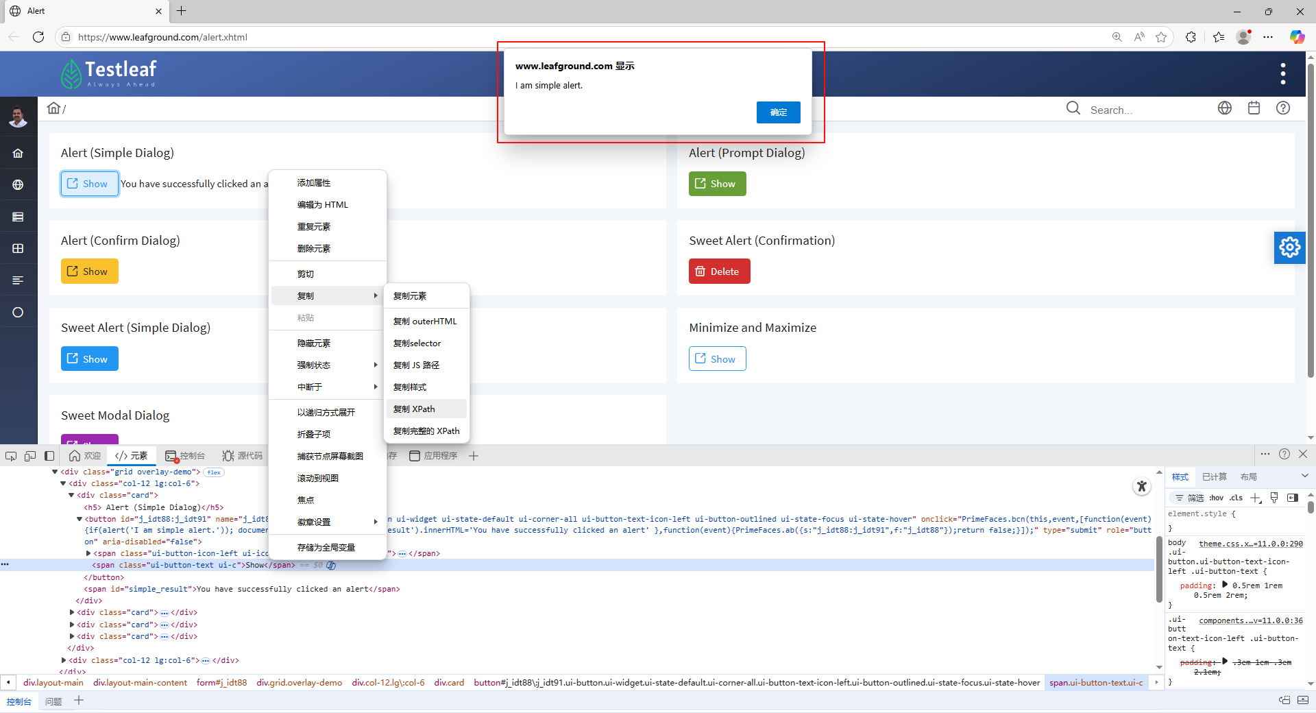 以测试网站 https://www.leafground.com/alert.xhtml 页面中的 各种弹窗 为例;