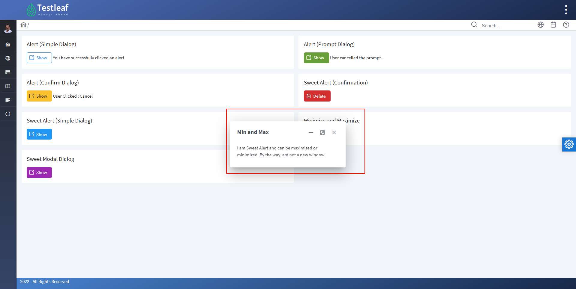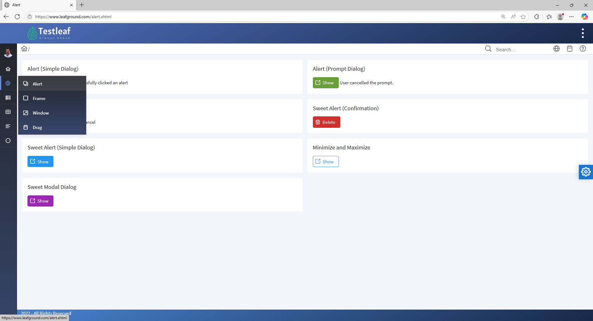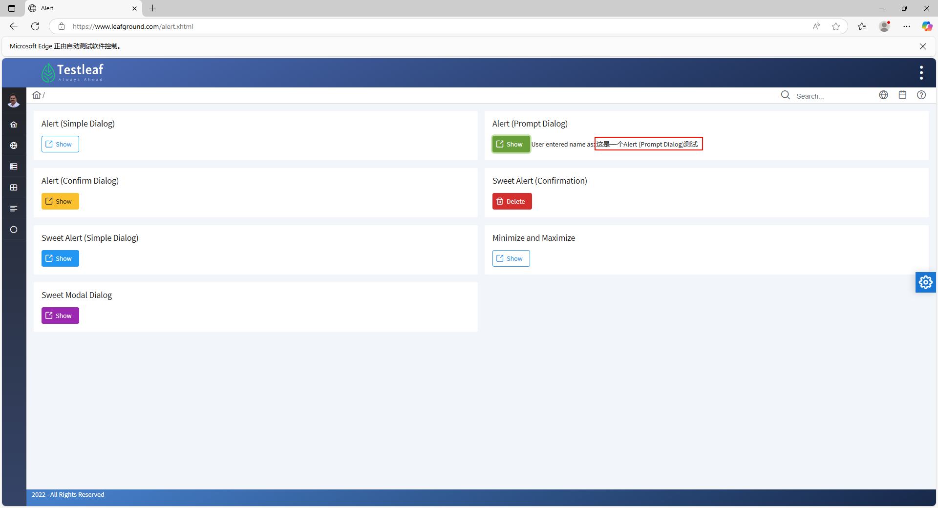 以测试网站 https://www.leafground.com/alert.xhtml 页面中的 各种弹窗 为例;