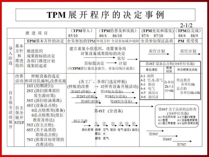 该模式起源于日本丰田公司,由大野耐一结合美国超市管理理念发展形成,强调以自主保全支撑生产系统。韩国企业在此基础上融入课题改善,形成双推动模式。中国学者李葆文提出TnPM体系,结合本土企业特点,以SOON体系和6S管理为基础开展实践。丰田TPS生产方式与阿里巴巴案例均印证了TPM推行需结合企业实际,通过持续改善适应动态生产环境。