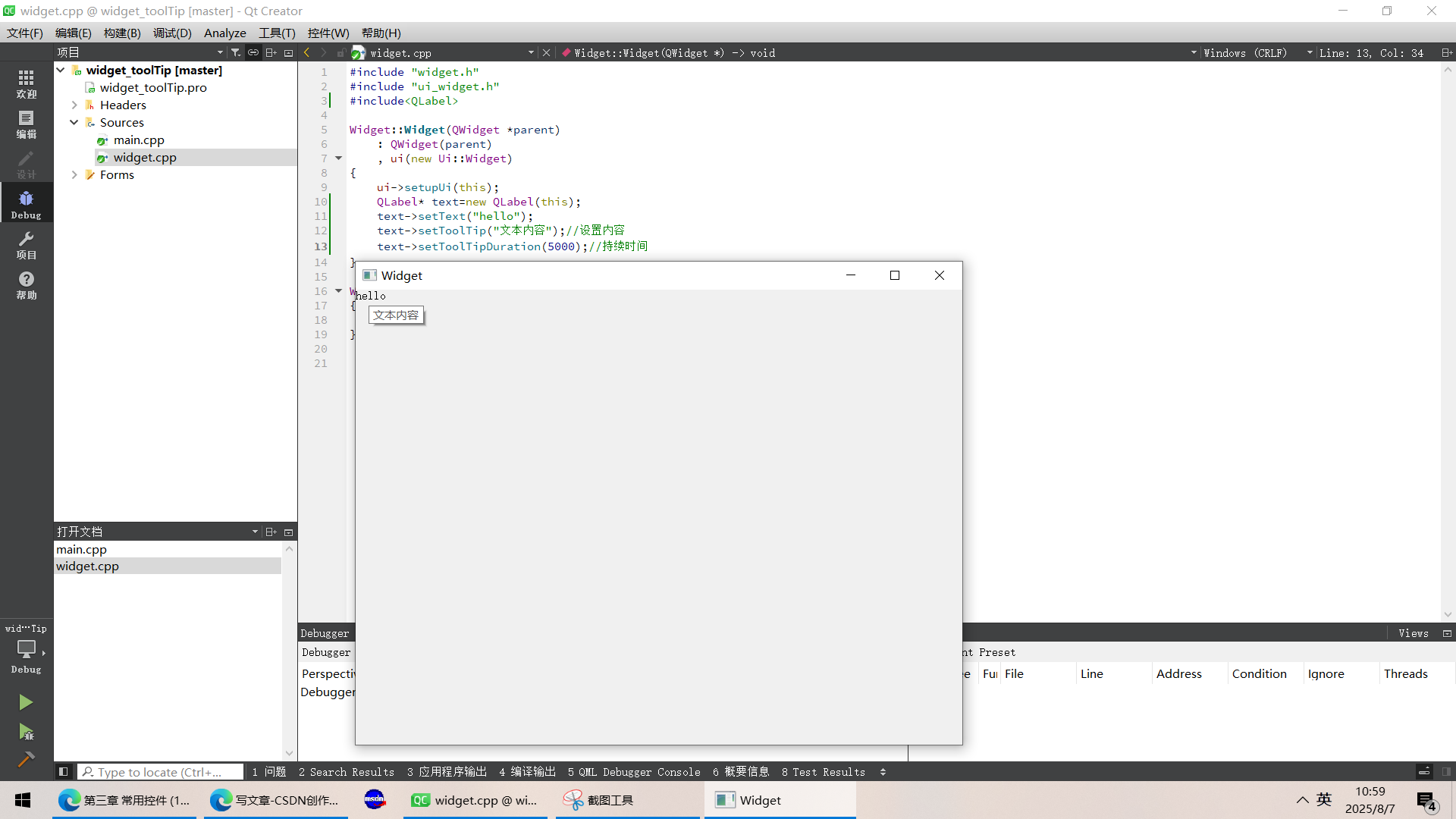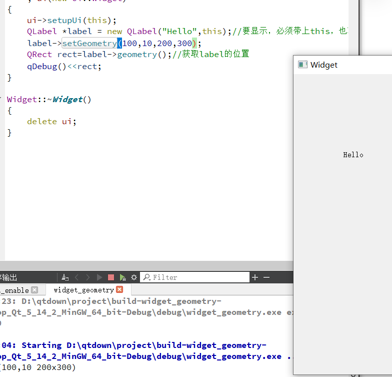 {ui->setupUi(this);QLabel *label = new QLabel("Hello",this);//要显示,必须带上this,也就是父控件label->setGeometry(100,10,200,300);QRect rect=label->geometry();//获取label的位置QRect rect2=label->frameGeometry();//获取label的位置,携带标题栏qDebug()<<"label:"<<rect;qDebug()<<"label:"<<rect2;