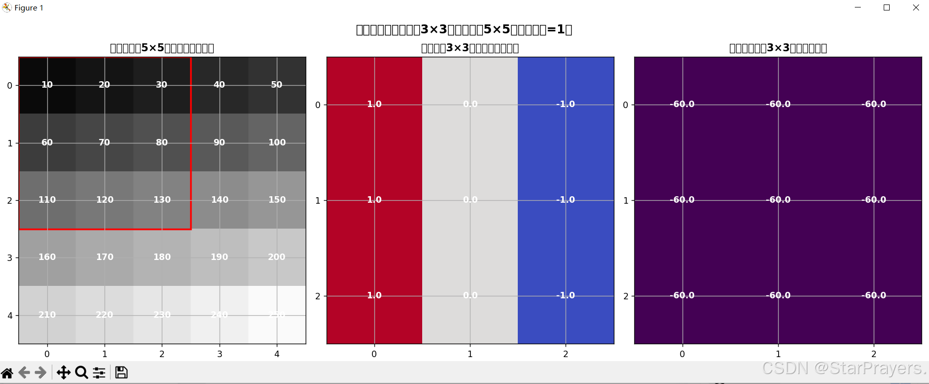 output_matrix = np.zeros((out_h, out_w), dtype=np.float32) # 初始化输出# ---------------------- 2. 计算卷积结果(核心过程) ----------------------
