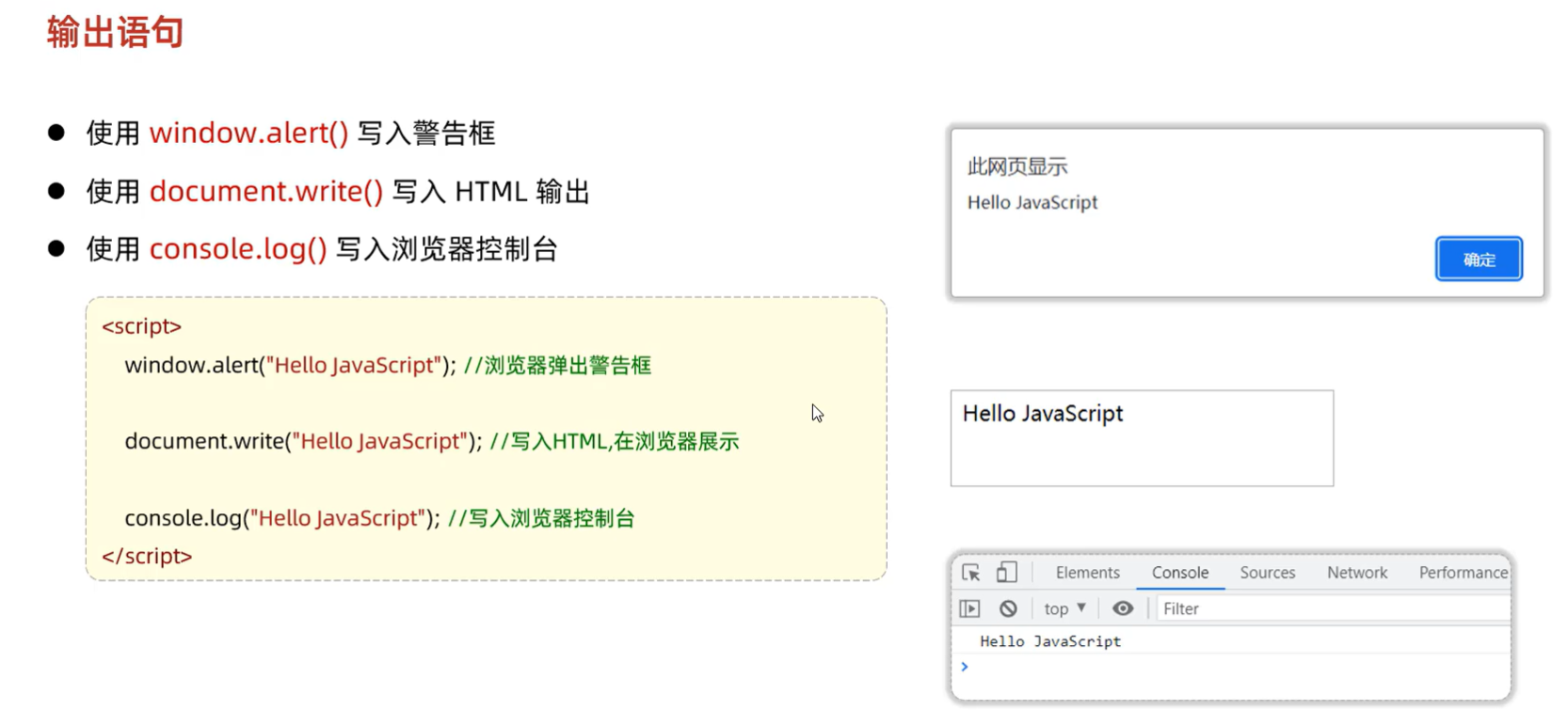 JavaScript代码必须写在<script>标签里,可以在html代码任意位置出现,一般写在<body>标签下面,提高显示速度