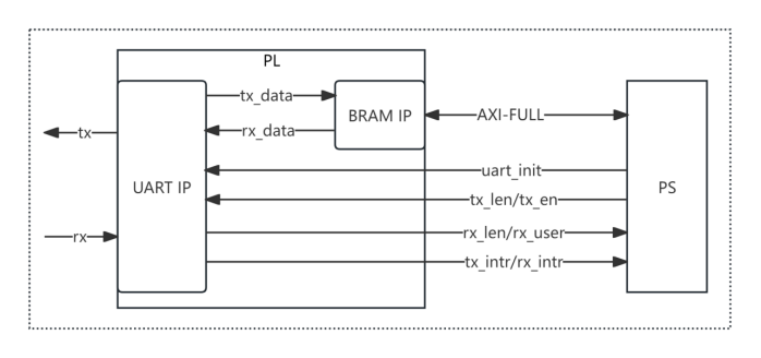 - PS进行IP初始化,通过AXI-Lite接口配置波特率、奇偶校验,并使能uart收发功能;