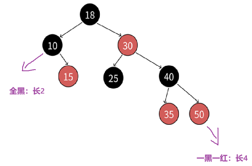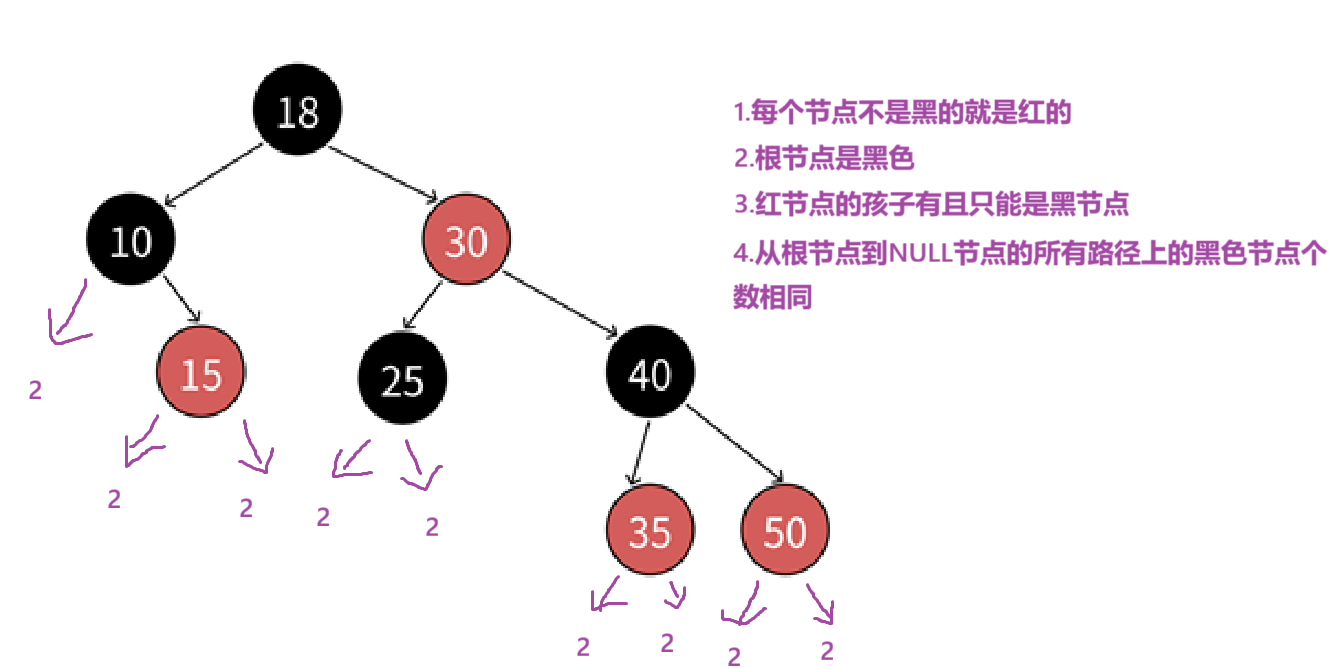 4. 对于任意⼀个结点,从该结点到其所有NULL结点的简单路径上,均包含相同数量的⿊⾊结点。即从根节点到NULL节点的所有路劲上的黑色节点个数相同