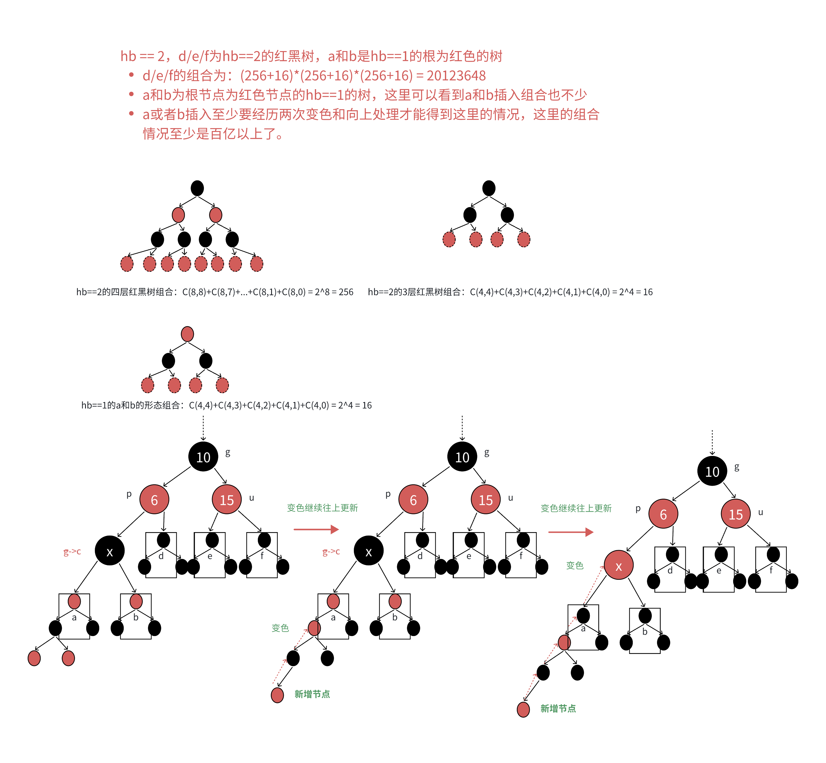 • 图1将以上类似的处理进⾏了抽象表达,d/e/f代表每条路径拥有hb个⿊⾊结点的⼦树,a/b代表每 条路径拥有hb-1个⿊⾊结点的根为红的⼦树,hb>=0。