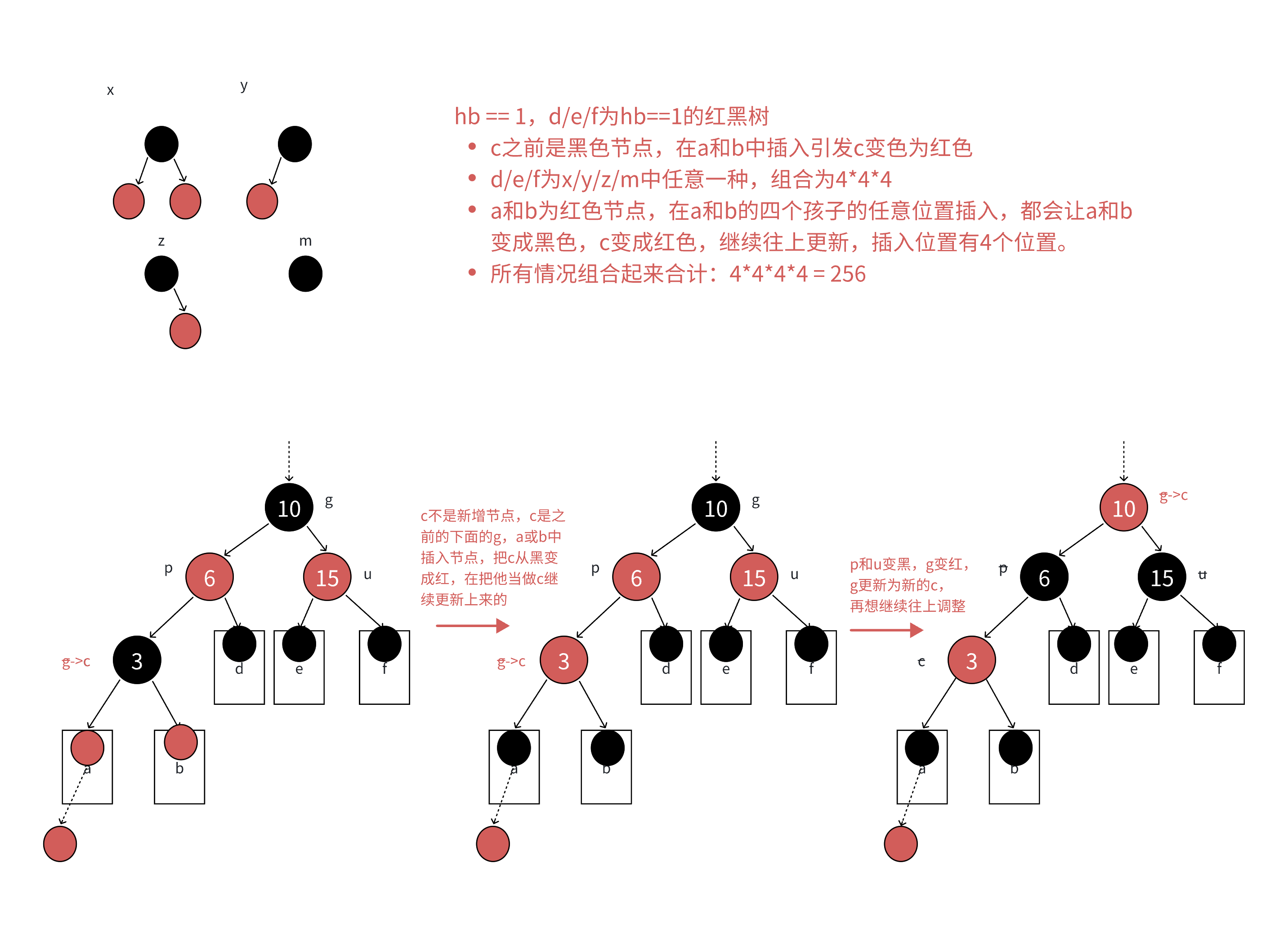 c为红,p为红,g为⿊,u不存在或者u存在且为⿊,u不存在,则c⼀定是新增结点,u存在且为⿊,则 c⼀定不是新增,c之前是⿊⾊的,是在c的⼦树中插⼊,符合情况1,变⾊将c从⿊⾊变成红⾊,更新上 来的。因为如果u存在且为黑,以g为根的左右路径上的黑色节点的个数不同,违反规则4。