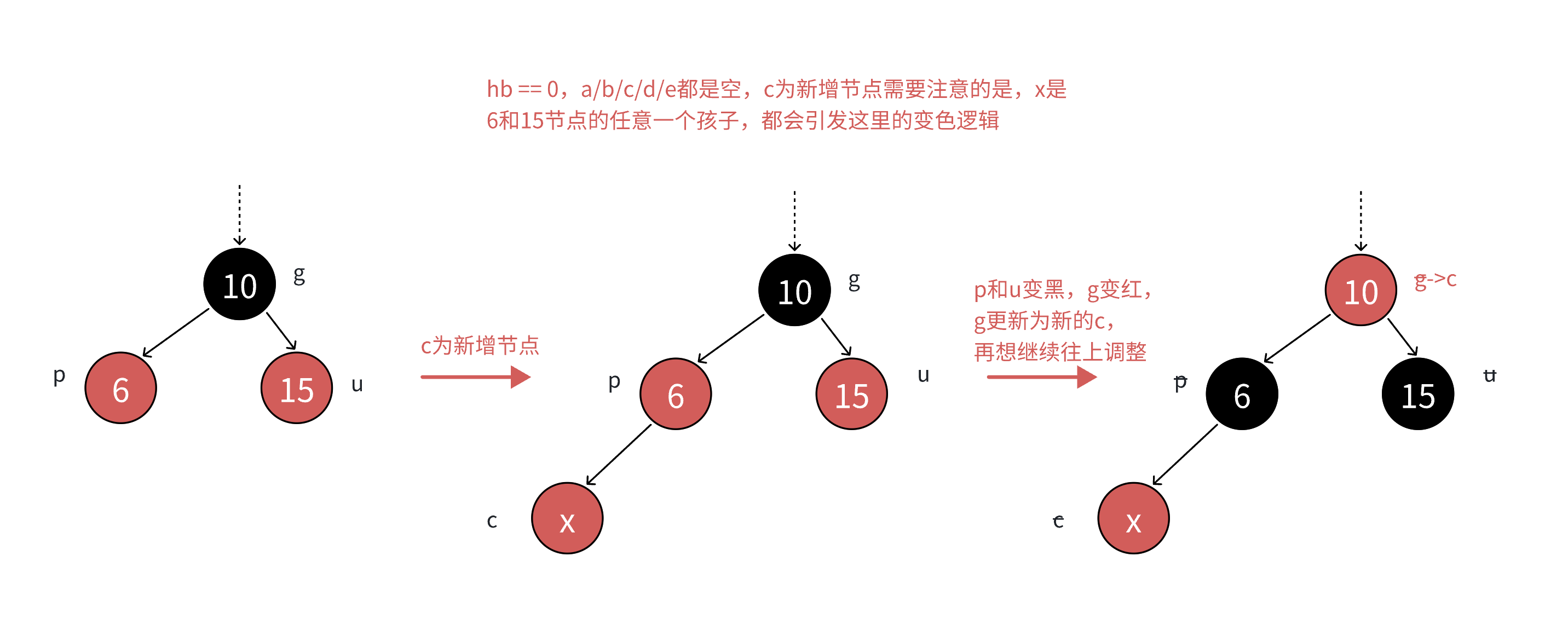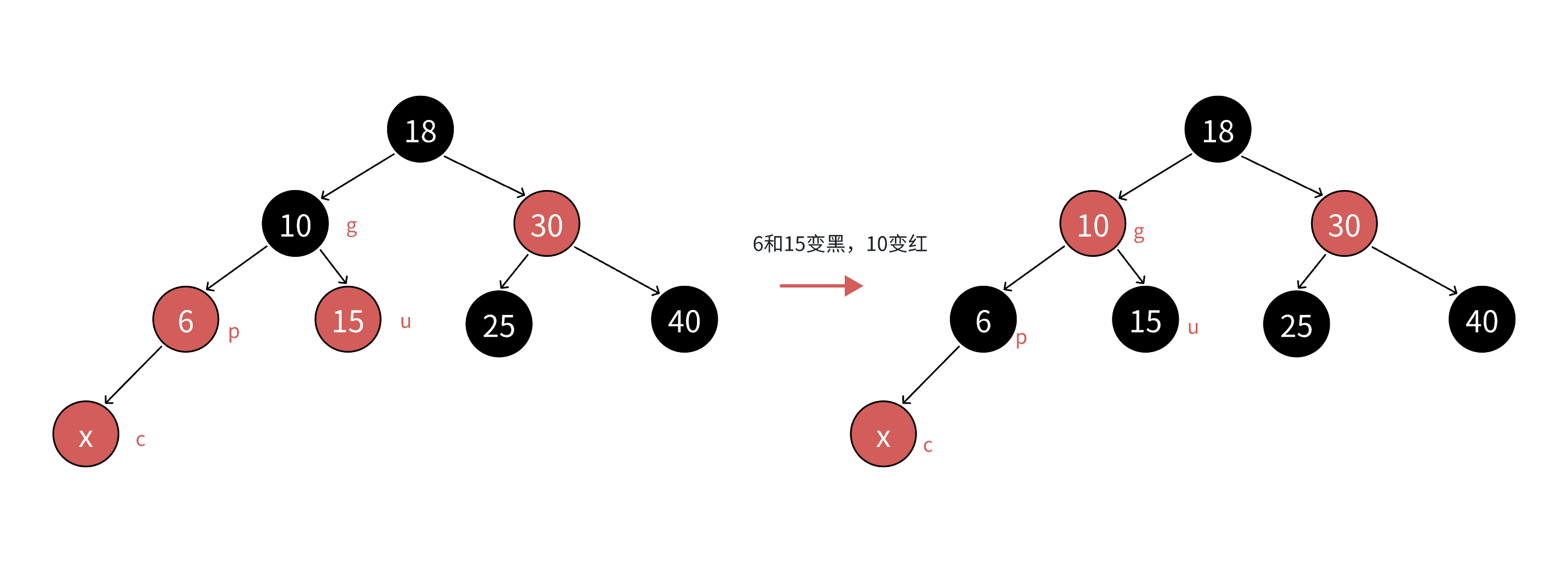 c为红,p为红,g为⿊,u存在且为红,则将p和u变⿊,g变红。在把g当做新的c,继续往上更新。
