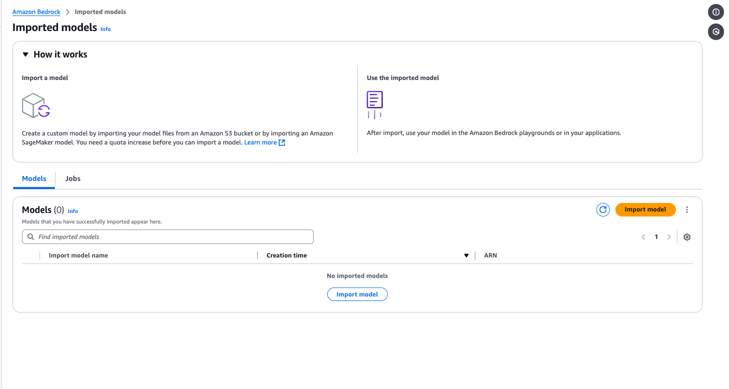 - 在亚马逊云科技 Bedrock 控制台的导航栏中,选择 Foundation models 下的 Imported models。