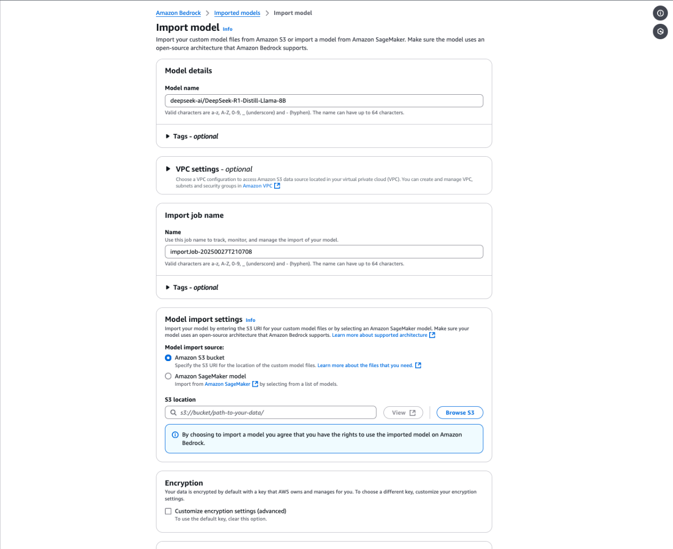- 当前支持的模型格式主要集中在基于 Llama 的架构。尽管 DeepSeek-R1 的蒸馏版本表现出色,但 AI 生态系统正在快速发展。请关注亚马逊云科技 Bedrock 模型目录,因为新的架构和更大的模型将通过该平台提供。
