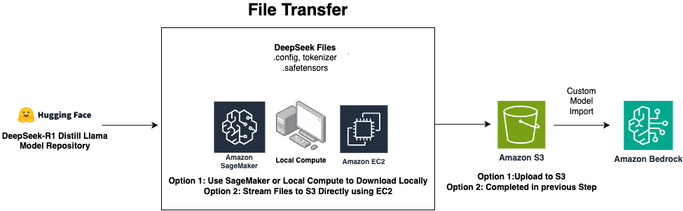 可以从 Amazon Simple Storage Service(Amazon S3)或 Amazon SageMaker AI 模型仓库导入这些模型,并通过 Amazon Bedrock 在完全托管的无服务器环境中部署。下图展示了端到端流程。
