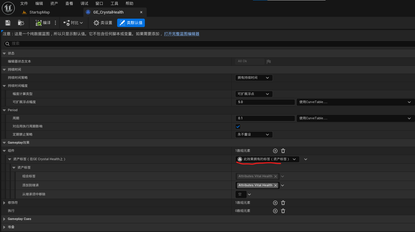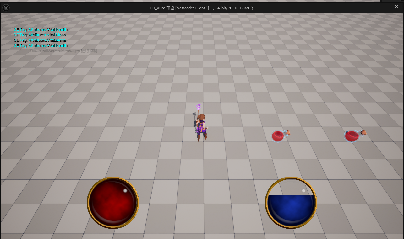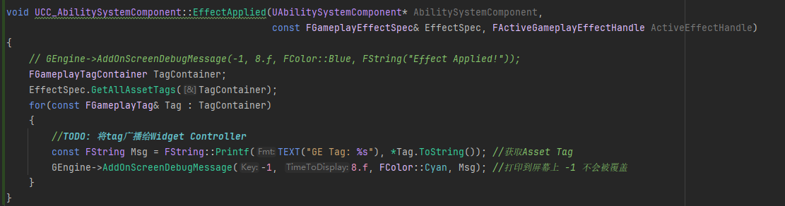 {// GEngine->AddOnScreenDebugMessage(-1, 8.f, FColor::Blue, FString("Effect Applied!"));FGameplayTagContainer TagContainer;EffectSpec.GetAllAssetTags(TagContainer);for(const FGameplayTag& Tag : TagContainer){//TODO: 将tag广播给Widget Controllerconst FString Msg = FString::Printf(TEXT("GE Tag: %s"), *Tag.ToString()); //获取Asset TagGEngine->AddOnScreenDebugMessage(-1, 8.f, FColor::Cyan, Msg); //打印到屏幕上 -1 不会被覆盖}