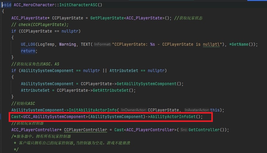 {ACC_PlayerState* CCPlayerState = GetPlayerState<ACC_PlayerState>(); //获取玩家状态// check(CCPlayerState);if (CCPlayerState == nullptr){UE_LOG(LogTemp, Warning, TEXT("CCPlayerState: %s - CCPlayerState is nullptl"), *GetName());return;}//获取玩家角色的ASC、ASif (AbilitySystemComponent == nullptr || AttributeSet == nullptr){AbilitySystemComponent = CCPlayerState->GetAbilitySystemComponent();AttributeSet = CCPlayerState->GetAttributeSet();}//初始化ASCAbilitySystemComponent->InitAbilityActorInfo(CCPlayerState, this);Cast<UCC_AbilitySystemComponent>(AbilitySystemComponent)->AbilityActorInfoSet();//获取玩家控制器ACC_PlayerController* CCPlayerController = Cast<ACC_PlayerController>(GetController());/*服务器中,拥有所有玩家控制器* 客户端只拥有自己的玩家控制器,当控制器为空是,游戏不能崩溃*/if (CCPlayerController){//获取HUDACC_HUD* CCHUD = Cast<ACC_HUD>(CCPlayerController->GetHUD());if (CCHUD) //仅对本地控制的玩家有效{//初始化HUDCCHUD ->InitOverlay(CCPlayerController, CCPlayerState, AbilitySystemComponent, AttributeSet);}}