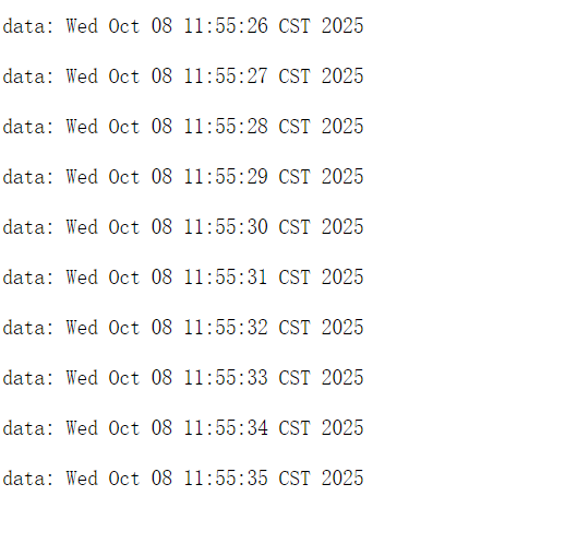 public class SseController {@RequestMapping("/data")public void data(HttpServletResponse response) throws IOException, InterruptedException {log.info("发送请求:data");response.setContentType("text/event-stream;charset=utf-8");PrintWriter printWriter=response.getWriter();for (int i = 0; i < 10; i++){String s = "data: " + new Date() + "\n\n";printWriter.write(s);printWriter.flush();Thread.sleep(1000);}}