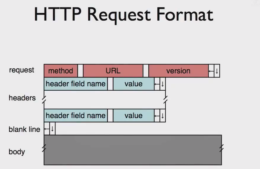 method即为指令如GET,URL是网址,version是版本。白色格子是空格,左箭头是回车(回到行首),下箭头表示换行。第一行后面是多行的请求头,每行一个,每个请求头行以字段名开头,后跟其值。然后是一个空行。当发送一个GET时body为空,但其他方法有可能不为空。