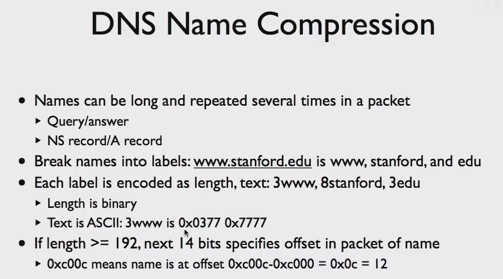 由于一个DNS报文中,同一个域名或其一部分常常会重复出现多次,所以域名会被拆成一个个标签,例如 www.stanford.edu
