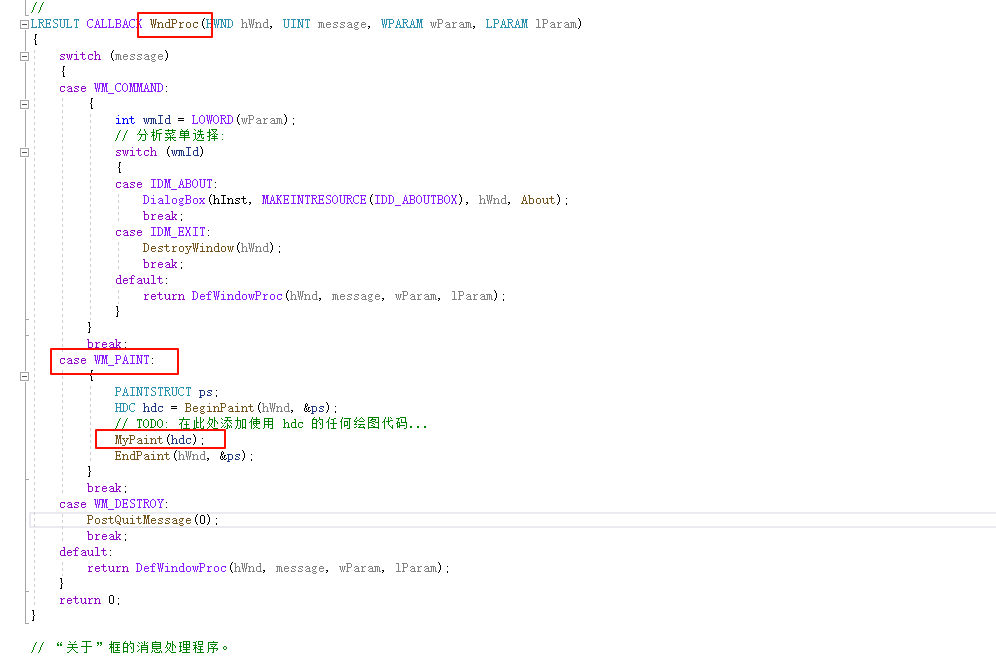 核心代码,在WndProc派发函数,case WM_PAINT的代码中加自己的绘制函数