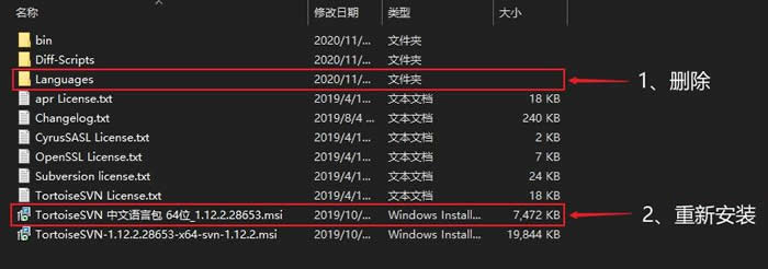 如果语言包版本换成一样的,还是出现无法选择中文的情况,就把 TortoiseSVN 安装路径下的 Languages 文件夹删掉。