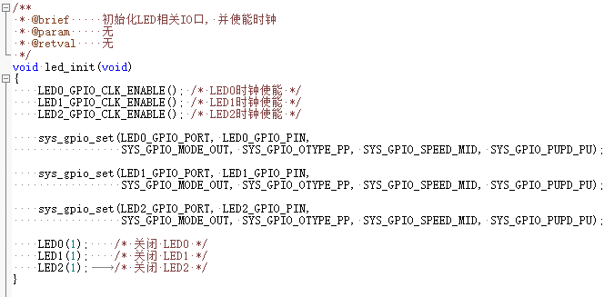 可以看到,上图中所有的代码都用空格缩进了(’.’),不过有一处地方,TAB 键还是没用空格替代,就是 LED2(1);这行代码之后的注释缩进,是一个 →,表示这个 TAB 键不是用空格替代的,这样在不同的编译器/软件打开这段代码的时候,这个非空格替代 TAB 键会有不同的长度,如果不是 4 个字符,就会和其他位置产生差异,因而无法对齐。