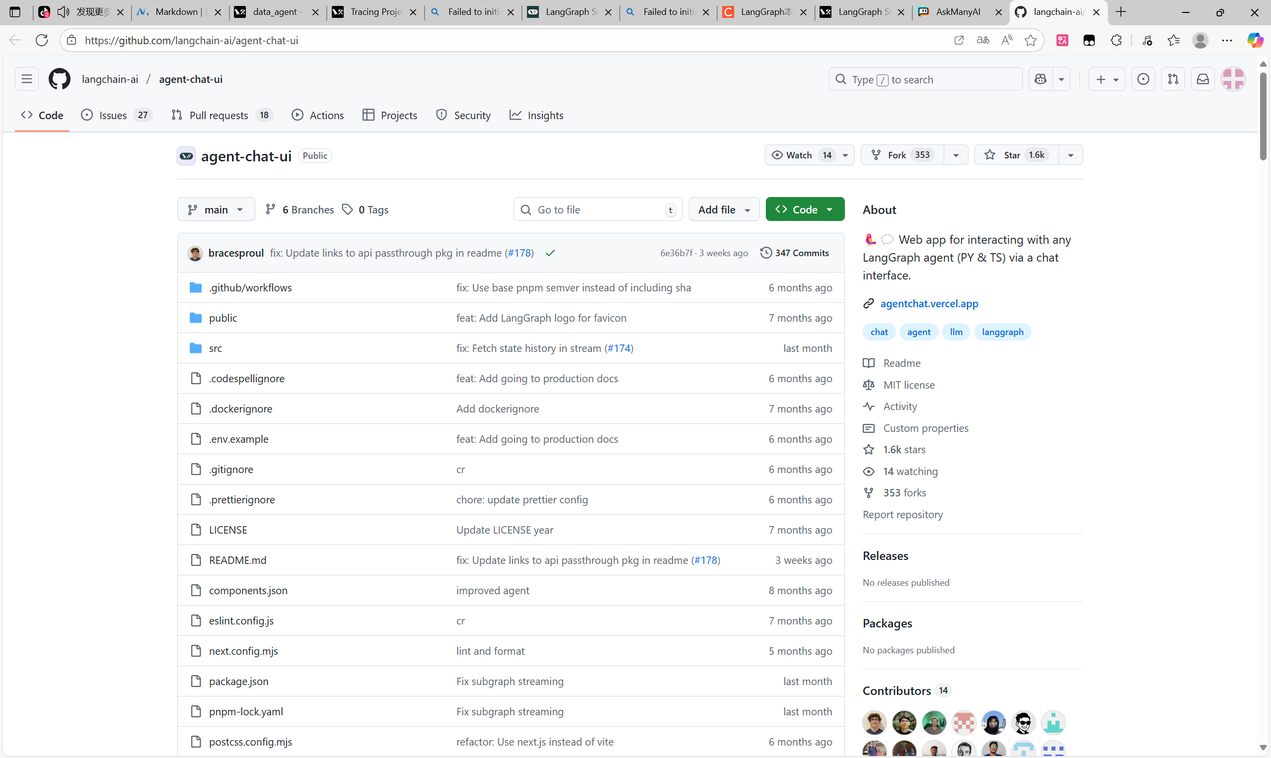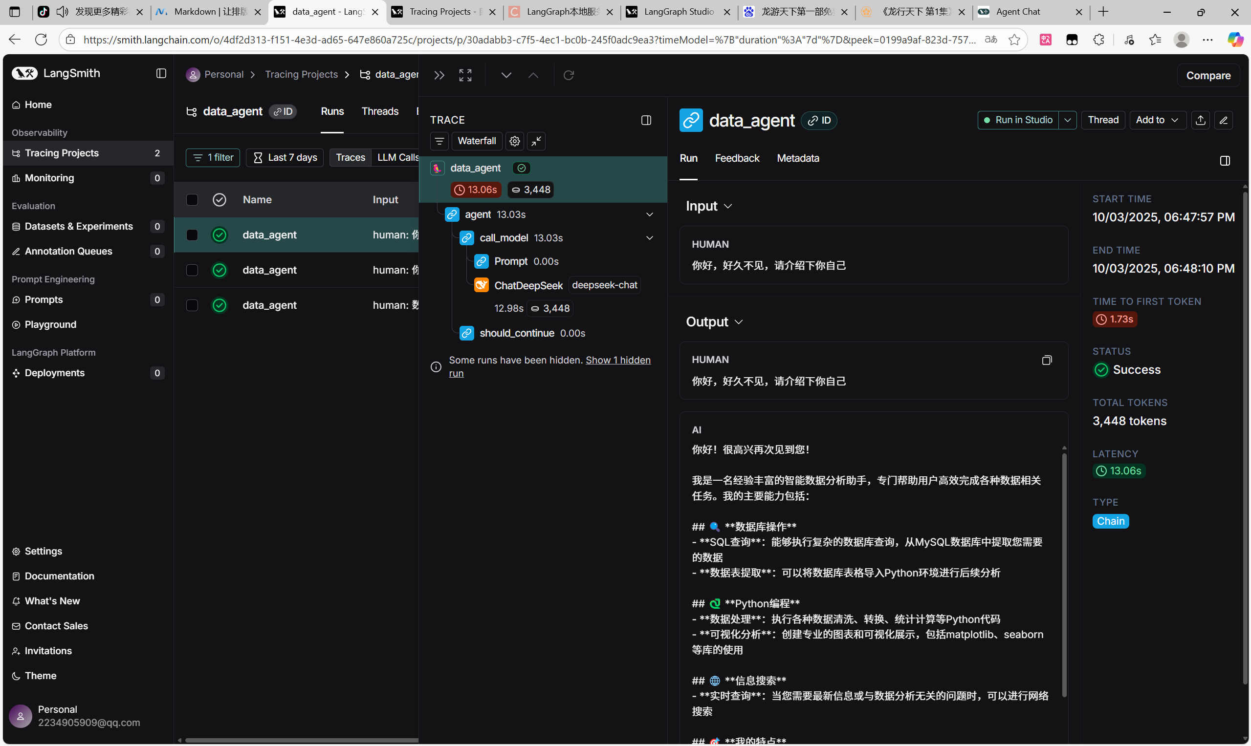 在左侧看到历史对话消息列表,同时前端的对话也能被LangSmith追踪到,任何的对话请求都可以在LangSmith主页中看到后端运行情况