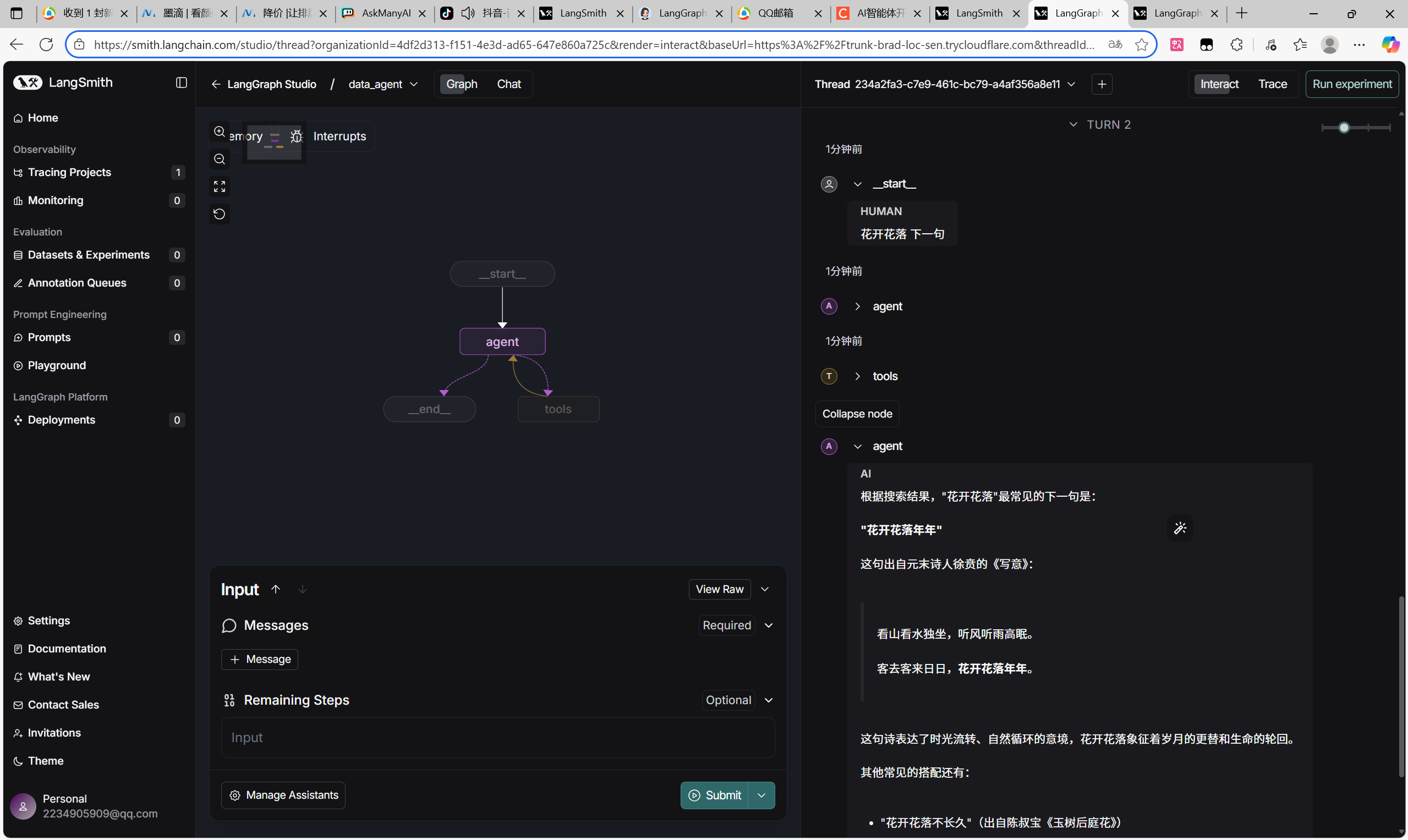 同时可以在langsmith中实时追踪智能体运行状态,只需要登录LangSmith官网,找到追踪的项目,就能看到每一次智能体的响应情况,至此后端服务就已经顺利部署上线。