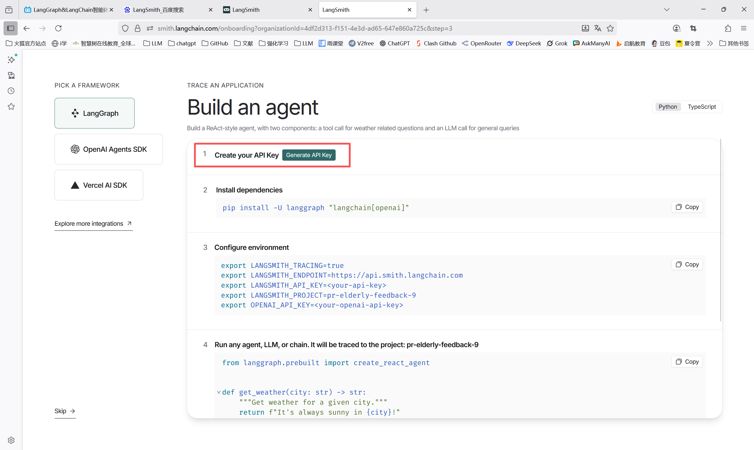 登陆时输入对应的agent名字以及可选输入LangSmith的API Key