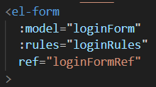 在el-form表单中通过:model作动态数据绑定,通过:rules作校验规则的绑定,ref是用于获取表单整体校验对象的响应式引用,后续可以通过该响应式引用获取整个表单对象来作整体校验: