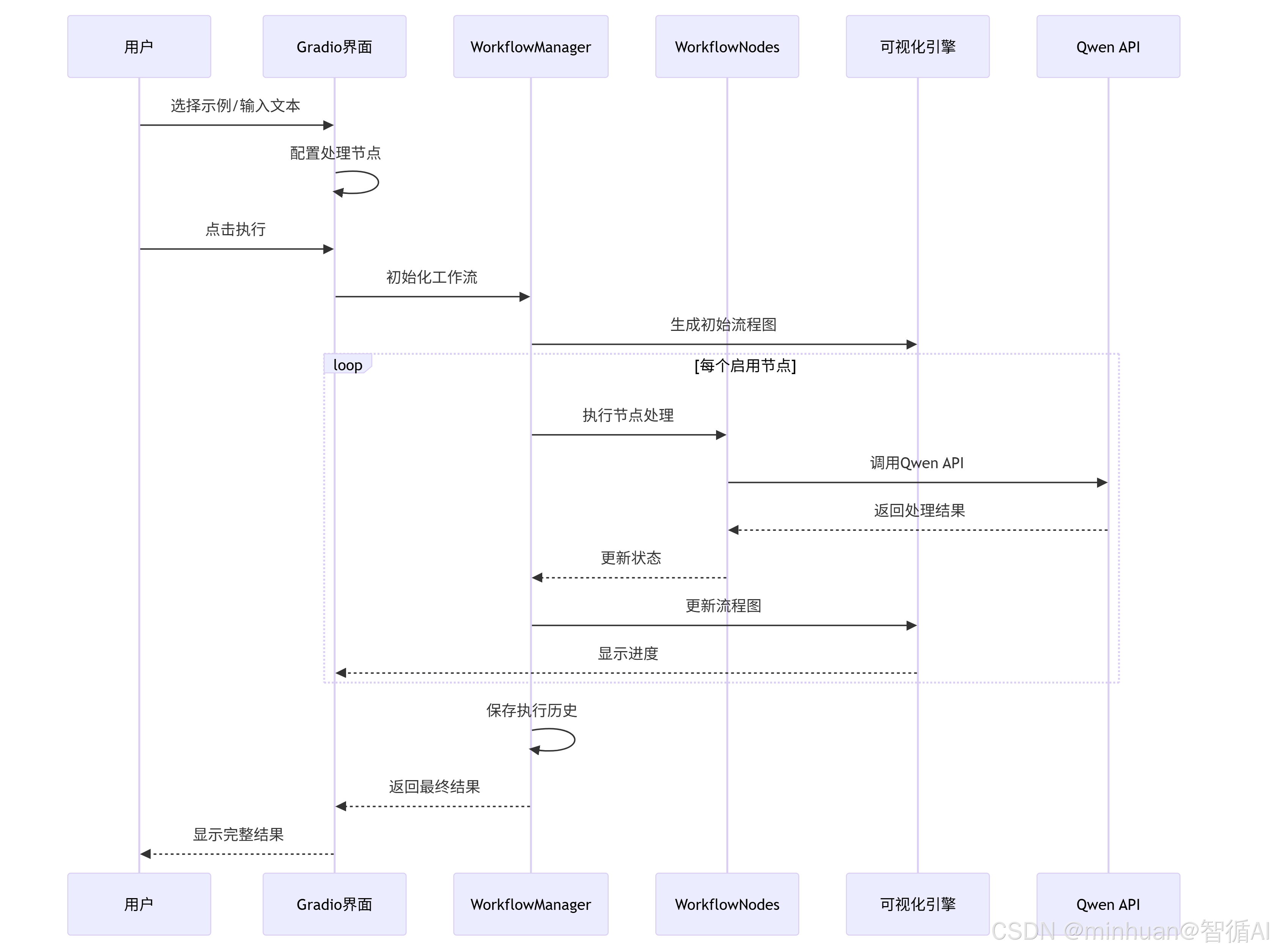 # 创建主界面块with gr.Blocks(title="LangGraph + Qwen 工作流定制", theme=gr.themes.Soft()) as interface:# 界面标题gr.Markdown("# LangGraph + Qwen 工作流定制系统")gr.Markdown("使用通义千问大模型和可视化工作流处理文本")# ==================== 工作流执行标签页 ====================with gr.Tab(" 工作流执行"):with gr.Row():# 左侧配置面板with gr.Column(scale=1):gr.Markdown("### ⚙️ 工作流配置")# 示例选择区域gr.Markdown("####快速示例")example_selector = gr.Dropdown(choices=list(EXAMPLES.keys()), # 示例选项label="选择示例场景",value=None,interactive=True)# 消息输入框message_input = gr.Textbox(label="输入消息",placeholder="请输入您想要处理的消息...",lines=3)# 节点配置区域with gr.Group():gr.Markdown("**选择处理节点:**")use_preprocess = gr.Checkbox(label="文本预处理", value=True # 默认启用)use_sentiment = gr.Checkbox(label="情感分析", value=True)use_keywords = gr.Checkbox(label="关键词提取", value=True)use_summary = gr.Checkbox(label="摘要生成", value=True)# 自定义提示词输入custom_prompt = gr.Textbox(label="自定义提示词 (可选)",placeholder="输入自定义的提示词,用于控制最终回复的生成...",lines=3)# 执行按钮execute_btn = gr.Button(" 执行工作流", variant="primary", size="lg")# 右侧结果显示面板with gr.Column(scale=2):gr.Markdown("### 执行结果")output_result = gr.Markdown(label="执行结果",value="等待执行工作流..." # 初始提示)# 流程图显示区域gr.Markdown("### 实时流程图")workflow_diagram = gr.Image(label="工作流执行状态",value=generate_workflow_diagram(["开始"], "开始"), # 初始流程图height=300 # 固定高度)# ==================== 执行历史标签页 ====================with gr.Tab(" 执行历史"):with gr.Row():history_display = gr.Markdown(label="执行历史")with gr.Row():# 历史记录操作按钮refresh_btn = gr.Button(" 刷新历史", variant="secondary")clear_btn = gr.Button(" 清空历史", variant="stop")# ==================== 工作流说明标签页 ====================with gr.Tab(" 工作流说明"):visualization_display = gr.Markdown(label="工作流可视化说明")# ==================== 事件绑定 ====================# 示例选择事件:选择示例后自动填充表单example_selector.change(fn=load_example,inputs=[example_selector],outputs=[message_input, use_preprocess, use_sentiment, use_keywords, use_summary, custom_prompt])# 执行按钮事件:点击后执行工作流execute_btn.click(fn=execute_custom_workflow,inputs=[message_input, use_preprocess, use_sentiment, use_keywords, use_summary, custom_prompt],outputs=[output_result, workflow_diagram])# 刷新历史事件refresh_btn.click(fn=show_execution_history,outputs=history_display)# 清空历史事件clear_btn.click(fn=lambda: "历史记录已清空",outputs=history_display)# ==================== 界面初始化 ====================# 界面加载时自动显示历史记录和工作流说明interface.load(fn=show_execution_history,outputs=history_display).then(fn=show_workflow_visualization,outputs=visualization_display)return interface