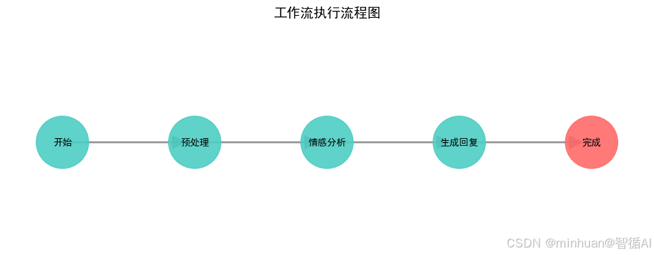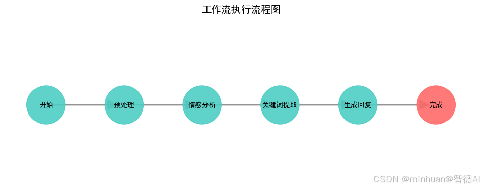 """# 动态添加可用信息if sentiment:prompt += f"情感倾向: {sentiment}\n"if keywords:prompt += f"关键词: {keywords}\n"if summary:prompt += f"内容摘要: {summary}\n"prompt += "\n请生成一个友好、专业的回复。"response = nodes.llm.invoke(prompt)return {"response": response}# 执行响应生成response_result = custom_response_node(current_state)current_state.update(response_result)execution_steps.append(" 生成回复")detailed_results["最终回复"] = response_result.get("response", "")# ==================== 完成阶段 ====================workflow_steps.append("完成")current_active_step = "完成"final_diagram = generate_workflow_diagram(workflow_steps, current_active_step)# 构建执行历史记录execution_record = {"input": message,"output": response_result["response"],"steps": execution_steps,"custom_prompt": custom_prompt,"detailed_results": detailed_results}workflow_manager.workflow_history.append(execution_record)# 格式化最终输出结果result_text = "## 执行完成!\n\n"# 显示每个步骤的详细结果for step_name, step_result in detailed_results.items():result_text += f"**{step_name}:**\n{step_result}\n\n"# 显示完整的执行流程result_text += f"**执行流程:** {' → '.join(execution_steps)}"# 返回最终结果yield result_text, final_diagramexcept Exception as e:# 错误处理error_text = f" 执行错误: {str(e)}"yield error_text, generate_workflow_diagram(["开始"], "开始")def show_execution_history():"""显示执行历史记录Returns:str: 格式化后的历史记录文本"""history = workflow_manager.get_execution_history()if not history:return " 暂无执行历史"# 构建历史记录显示文本history_text = "## 最近执行历史\n\n"# 只显示最近5条记录for i, record in enumerate(history[-5:], 1):history_text += f"### 执行记录 {i}\n"history_text += f"**输入:** {record['input']}\n\n"# 长文本截断处理if len(record['output']) > 200:history_text += f"**输出:** {record['output'][:200]}...\n\n"else:history_text += f"**输出:** {record['output']}\n\n"history_text += f"**步骤:** {' → '.join(record['steps'])}\n\n"if record.get('custom_prompt'):history_text += f"**自定义提示:** {record['custom_prompt']}\n\n"history_text += "---\n\n"return history_textdef show_workflow_visualization():"""显示工作流可视化说明Returns:str: 工作流说明文档"""visualization = """