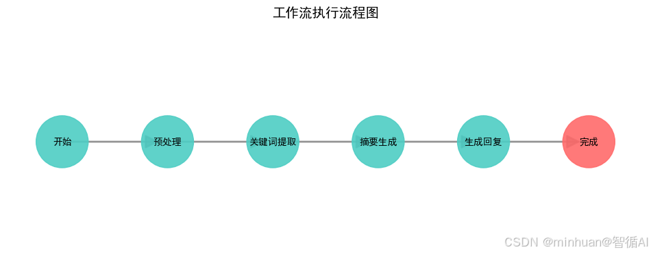 def generate_workflow_diagram(steps, current_step=None):"""生成工作流执行流程图Args:steps: 步骤列表,表示工作流的执行顺序current_step: 当前正在执行的步骤,用于高亮显示Returns:str: 生成的流程图临时文件路径"""try:# 创建图形和网络图对象plt.figure(figsize=(12, 4))G = nx.DiGraph()# 定义节点位置和样式pos = {}node_colors = []node_labels = {}# 添加节点到图中for i, step in enumerate(steps):G.add_node(step)# 水平排列节点pos[step] = (i * 2, 0)# 简化的节点标签显示if step == "开始":label = "开始"elif step == "完成":label = "完成"else:label = stepnode_labels[step] = label# 当前执行到的节点用红色高亮,其他用青色if step == current_step:node_colors.append('#FF6B6B') # 红色高亮else:node_colors.append('#4ECDC4') # 青色# 添加边连接节点for i in range(len(steps) - 1):G.add_edge(steps[i], steps[i + 1])# 绘制图形plt.clf() # 清除之前的图形plt.figure(figsize=(12, 4))# 绘制节点nx.draw_networkx_nodes(G, pos, node_color=node_colors,node_size=3000,alpha=0.9)# 绘制边nx.draw_networkx_edges(G, pos,edge_color='#666666',arrows=True,arrowsize=30,width=2,alpha=0.7)# 绘制节点标签nx.draw_networkx_labels(G, pos, labels=node_labels,font_size=10,font_weight='bold')# 设置标题和坐标轴plt.title("工作流执行流程图", fontsize=14, fontweight='bold', pad=20)plt.axis('off') # 隐藏坐标轴# 保存到临时文件with tempfile.NamedTemporaryFile(suffix='.png', delete=False) as tmp_file:plt.savefig(tmp_file.name, format='png', dpi=100, bbox_inches='tight', facecolor='white')plt.close()return tmp_file.nameexcept Exception as e:# 错误处理:生成占位图print(f"生成流程图错误: {e}")with tempfile.NamedTemporaryFile(suffix='.png', delete=False) as tmp_file:plt.figure(figsize=(8, 2))plt.text(0.5, 0.5, "流程图生成中...", ha='center', va='center', fontsize=16)plt.axis('off')plt.savefig(tmp_file.name, bbox_inches='tight', facecolor='white')plt.close()return tmp_file.name