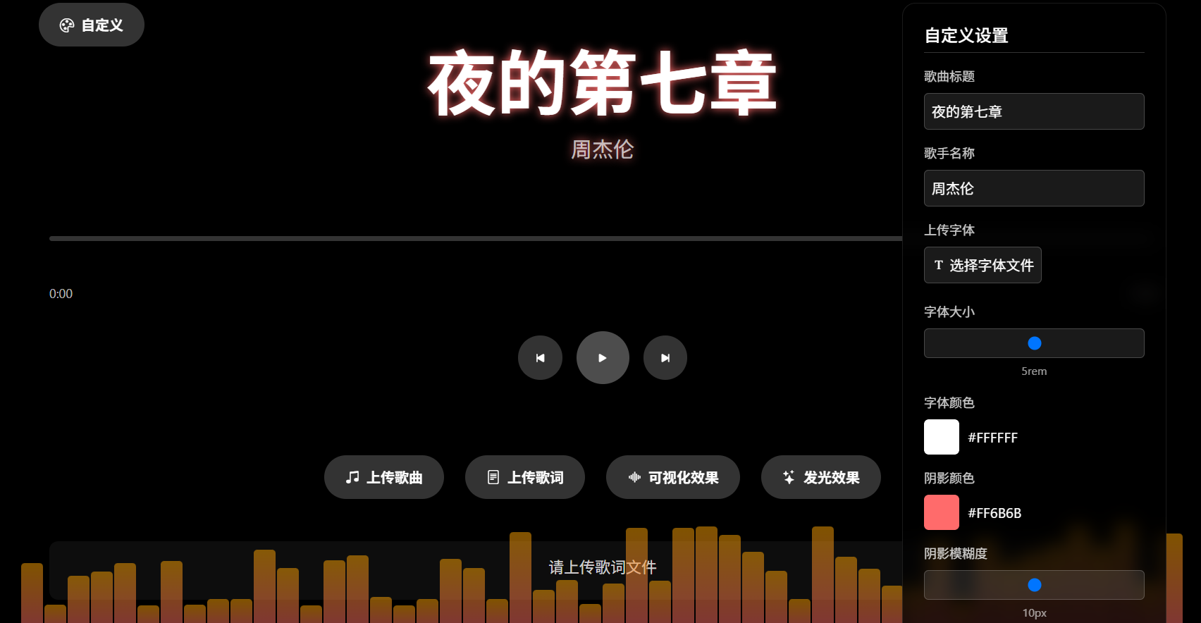 <body><div class="container"><button class="toggle-customization" id="toggleCustomization"><i class="bi bi-palette"></i> 自定义</button><div class="customization-panel" id="customizationPanel"><h3>自定义设置</h3><div class="form-group"><label for="songTitleInput">歌曲标题</label><input type="text" id="songTitleInput" class="form-control" value="夜的第七章" placeholder="输入歌曲标题"></div><div class="form-group"><label for="artistInput">歌手名称</label><input type="text" id="artistInput" class="form-control" value="周杰伦" placeholder="输入歌手名称"></div><div class="form-group"><label for="fontUpload">上传字体</label><div class="file-input-container"><button class="form-control" style="text-align: left;"><i class="bi bi-fonts"></i> 选择字体文件</button><input type="file" id="fontUpload" accept=".ttf,.otf,.woff,.woff2"></div></div><div class="form-group"><label for="fontSize">字体大小</label><input type="range" id="fontSize" class="form-control" min="2" max="8" step="0.1" value="5"><div style="color: rgba(255,255,255,0.6); font-size: 0.8rem; text-align: center; margin-top: 5px;"><span id="fontSizeValue">5rem</span></div></div><div class="form-group"><label>字体颜色</label><div class="color-input-container"><input type="color" id="fontColor" class="color-input" value="#ffffff"><span id="fontColorValue">#FFFFFF</span></div></div><div class="form-group"><label>阴影颜色</label><div class="color-input-container"><input type="color" id="shadowColor" class="color-input" value="#ff6b6b"><span id="shadowColorValue">#FF6B6B</span></div></div><div class="form-group"><label for="shadowBlur">阴影模糊度</label><input type="range" id="shadowBlur" class="form-control" min="0" max="20" value="10"><div style="color: rgba(255,255,255,0.6); font-size: 0.8rem; text-align: center; margin-top: 5px;"><span id="shadowBlurValue">10px</span></div></div><button id="applySettings" class="form-control" style="background: rgba(255,107,107,0.7); margin-top: 1rem;"><i class="bi bi-check-lg"></i> 应用设置</button></div><div class="song-title-container"><div class="song-title" id="songTitle">夜的第七章</div><div class="artist-name" id="artistName">周杰伦</div></div><div class="progress-container"><div class="progress-bar" id="progressBar"></div></div><div class="time-display"><span id="currentTime">0:00</span><span id="totalTime">0:00</span></div><div class="music-controls"><button id="prevBtn"><i class="bi bi-skip-start-fill"></i></button><button id="playBtn" class="play-pause-btn"><i class="bi bi-play-fill"></i></button><button id="nextBtn"><i class="bi bi-skip-end-fill"></i></button></div><div class="controls"><div class="file-input-container"><button id="musicUploadBtn"><i class="bi bi-music-note-beamed"></i> 上传歌曲</button><input type="file" id="musicUpload" accept="audio/*"></div><div class="file-input-container"><button id="lyricsUploadBtn"><i class="bi bi-file-text"></i> 上传歌词</button><input type="file" id="lyricsUpload" accept=".lrc,.txt"></div><button id="toggleVisualization"><i class="bi bi-soundwave"></i> 可视化效果</button><button id="toggleGlow"><i class="bi bi-stars"></i> 发光效果</button></div><div class="lyrics-display" id="lyricsDisplay"><div class="lyrics-line">请上传歌词文件</div></div><div class="visualization" id="visualization"></div></div><script>document.addEventListener('DOMContentLoaded', () => {// 获取DOM元素const songTitle = document.getElementById('songTitle');const artistName = document.getElementById('artistName');const songTitleInput = document.getElementById('songTitleInput');const artistInput = document.getElementById('artistInput');const fontSize = document.getElementById('fontSize');const fontSizeValue = document.getElementById('fontSizeValue');const fontColor = document.getElementById('fontColor');const fontColorValue = document.getElementById('fontColorValue');const shadowColor = document.getElementById('shadowColor');const shadowColorValue = document.getElementById('shadowColorValue');const shadowBlur = document.getElementById('shadowBlur');const shadowBlurValue = document.getElementById('shadowBlurValue');const fontUpload = document.getElementById('fontUpload');const applySettings = document.getElementById('applySettings');const toggleCustomization = document.getElementById('toggleCustomization');const customizationPanel = document.getElementById('customizationPanel');const musicUpload = document.getElementById('musicUpload');const musicUploadBtn = document.getElementById('musicUploadBtn');const lyricsUpload = document.getElementById('lyricsUpload');const lyricsUploadBtn = document.getElementById('lyricsUploadBtn');const lyricsDisplay = document.getElementById('lyricsDisplay');const playBtn = document.getElementById('playBtn');const prevBtn = document.getElementById('prevBtn');const nextBtn = document.getElementById('nextBtn');const progressBar = document.getElementById('progressBar');const currentTime = document.getElementById('currentTime');const totalTime = document.getElementById('totalTime');const toggleVisualization = document.getElementById('toggleVisualization');const visualization = document.getElementById('visualization');const toggleGlow = document.getElementById('toggleGlow');let audioElement = null;let isPlaying = false;let isVisualizationVisible = true;let isGlowEnabled = false;let customFont = null;let lyricsData = [];let currentLyricIndex = 0;// 初始化设置function initSettings() {// 设置字体大小fontSizeValue.textContent = `${fontSize.value}rem`;songTitle.style.fontSize = `${fontSize.value}rem`;// 设置字体颜色fontColorValue.textContent = fontColor.value.toUpperCase();songTitle.style.color = fontColor.value;// 设置阴影updateTextShadow();// 应用歌曲标题和歌手名称songTitle.textContent = songTitleInput.value;artistName.textContent = artistInput.value;}// 更新文本阴影function updateTextShadow() {const blur = `${shadowBlur.value}