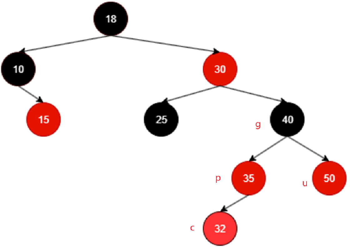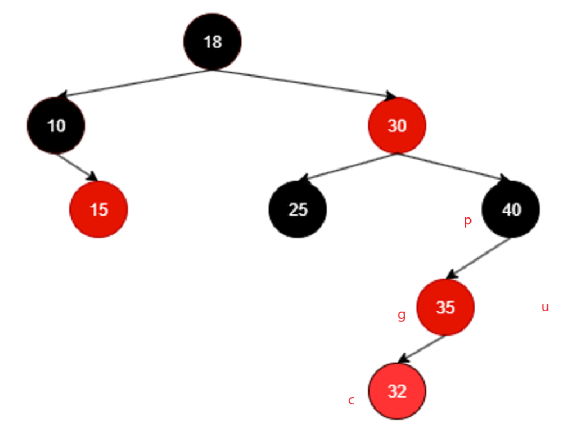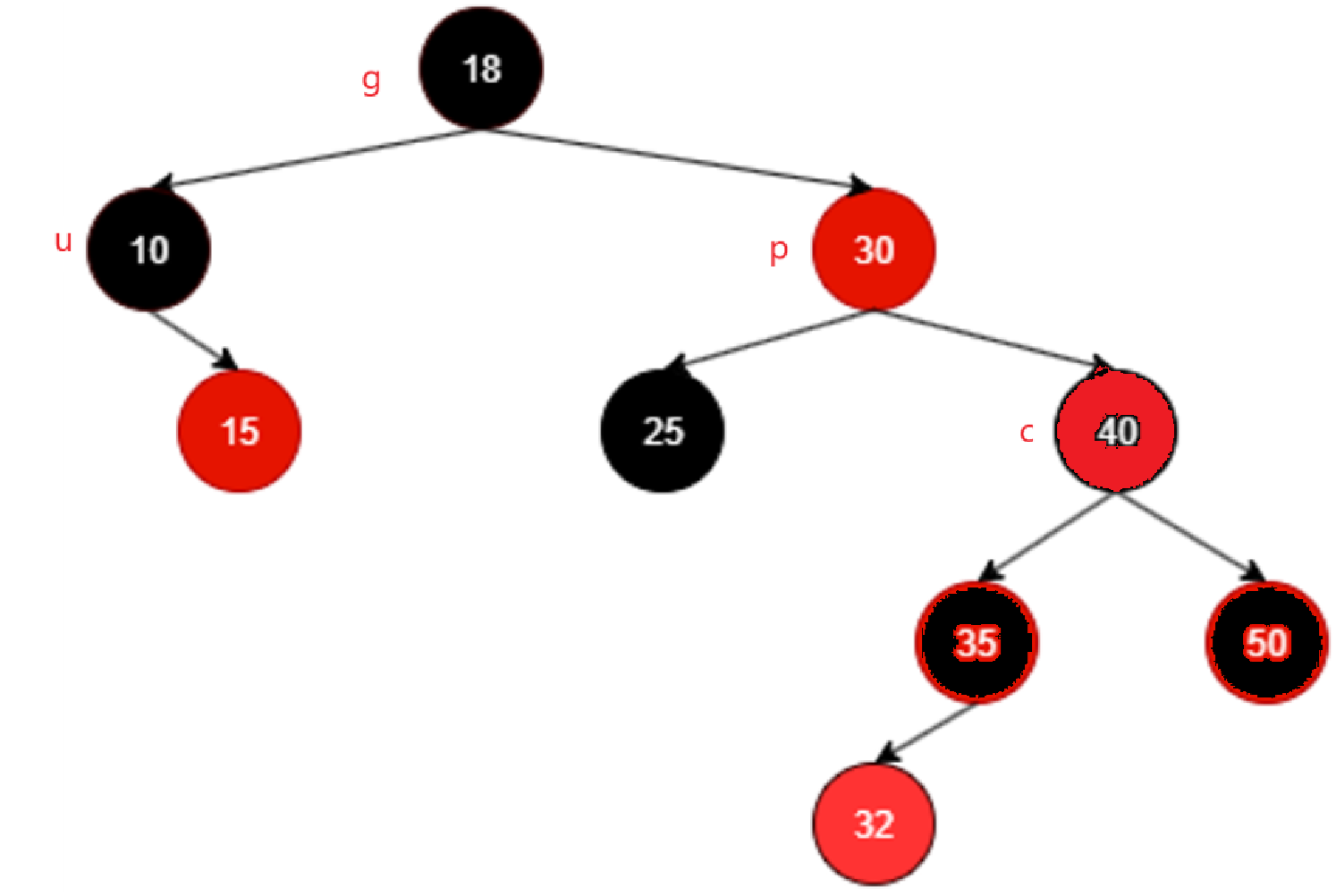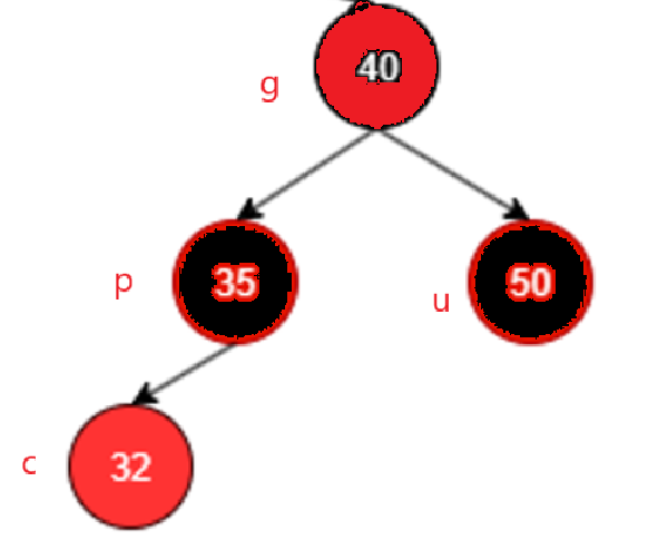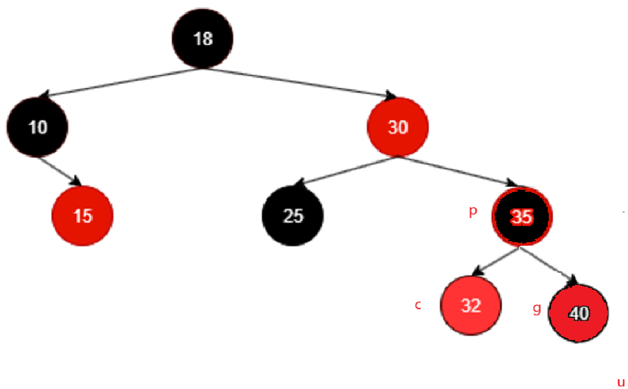 再次明确昂,走到这里我们已经处理好了插入结点就是根结点的情况了,所以插入的一定是叶子结点,那么c一定存在不用说,p也是一定存在;但是g和u可能不存在。