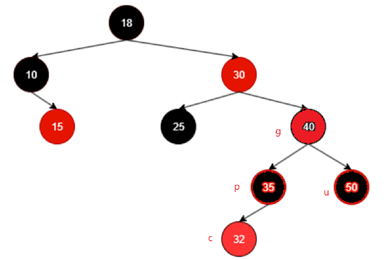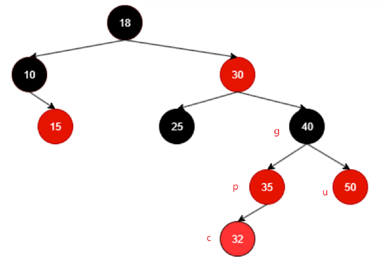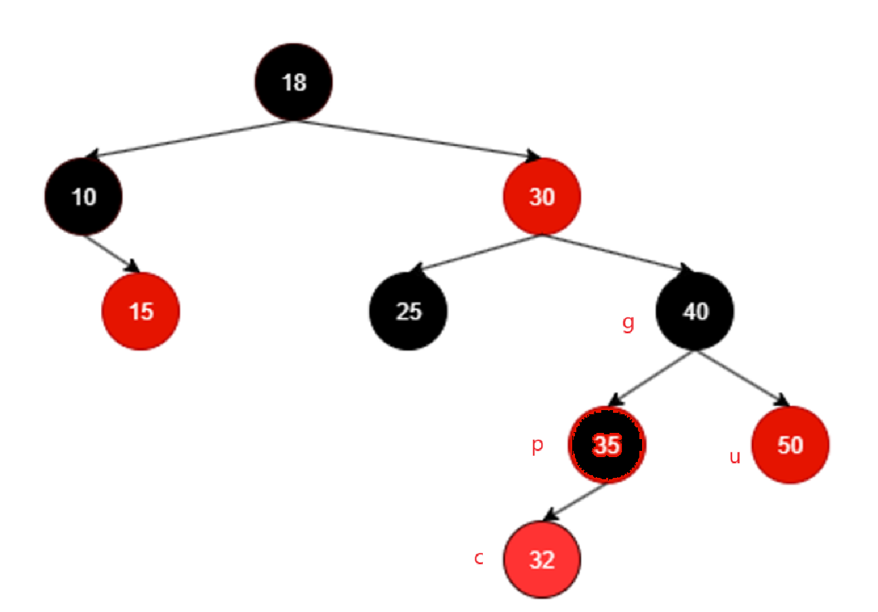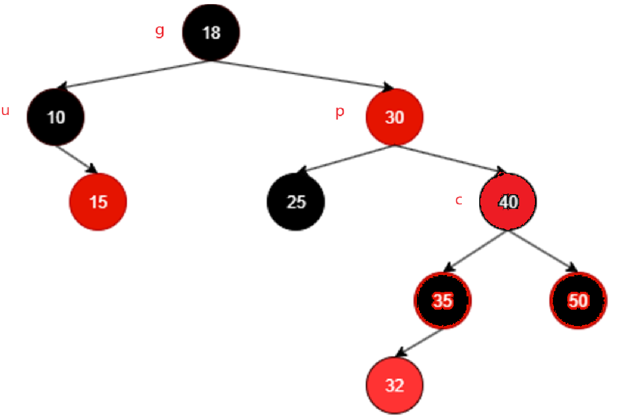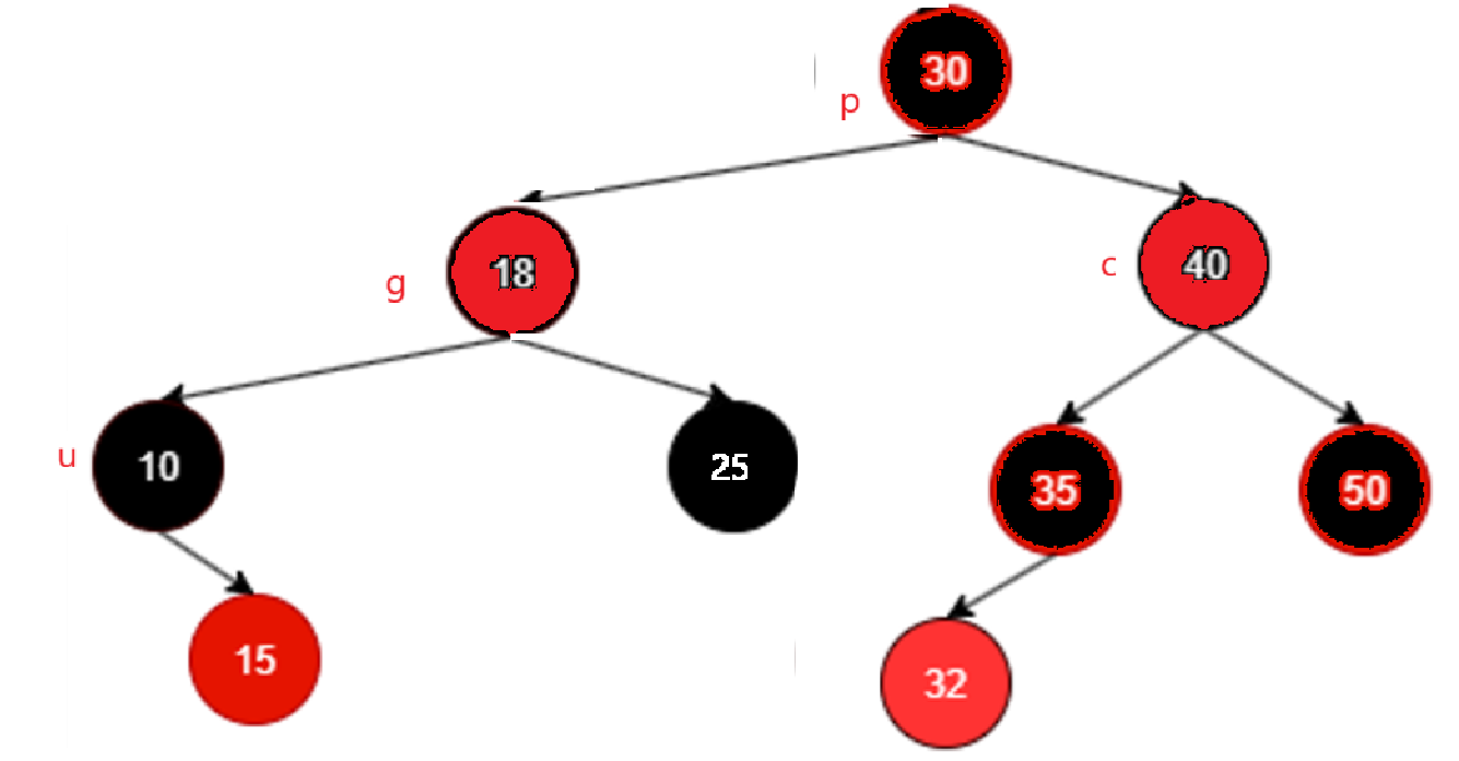 再次明确昂,走到这里我们已经处理好了插入结点就是根结点的情况了,所以插入的一定是叶子结点,那么c一定存在不用说,p也是一定存在;但是g和u可能不存在。