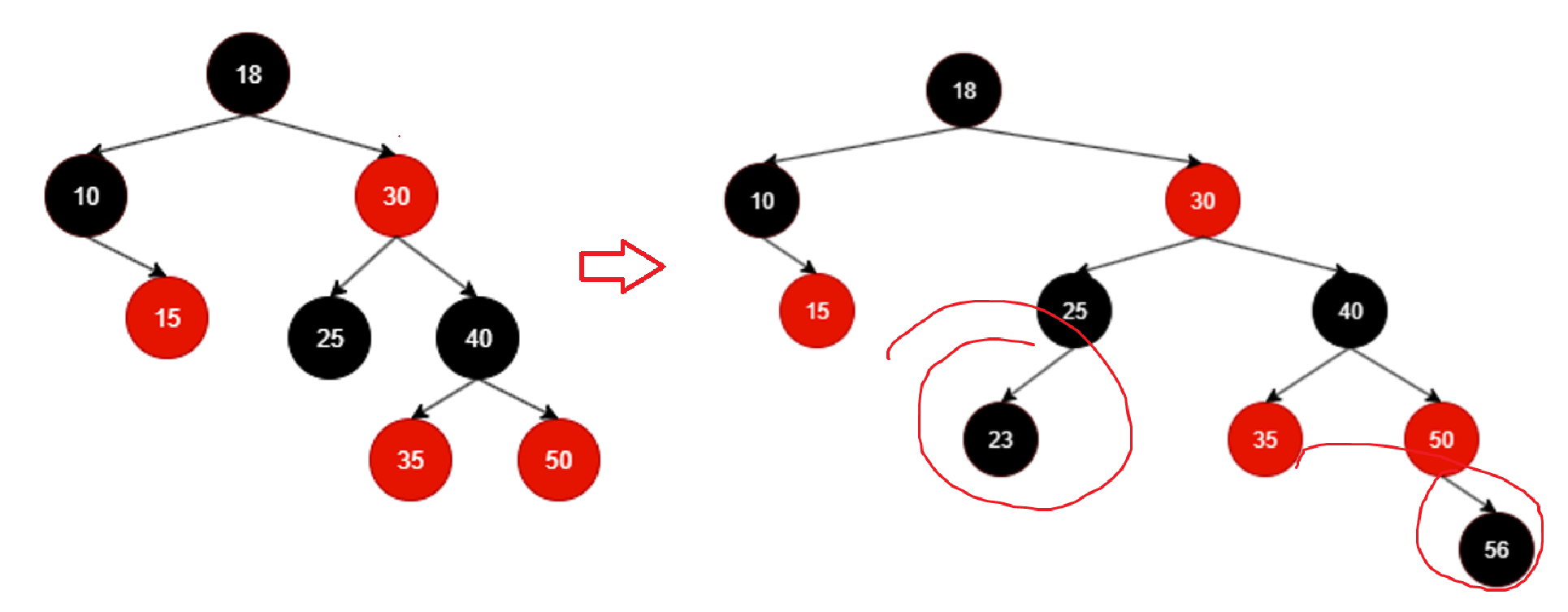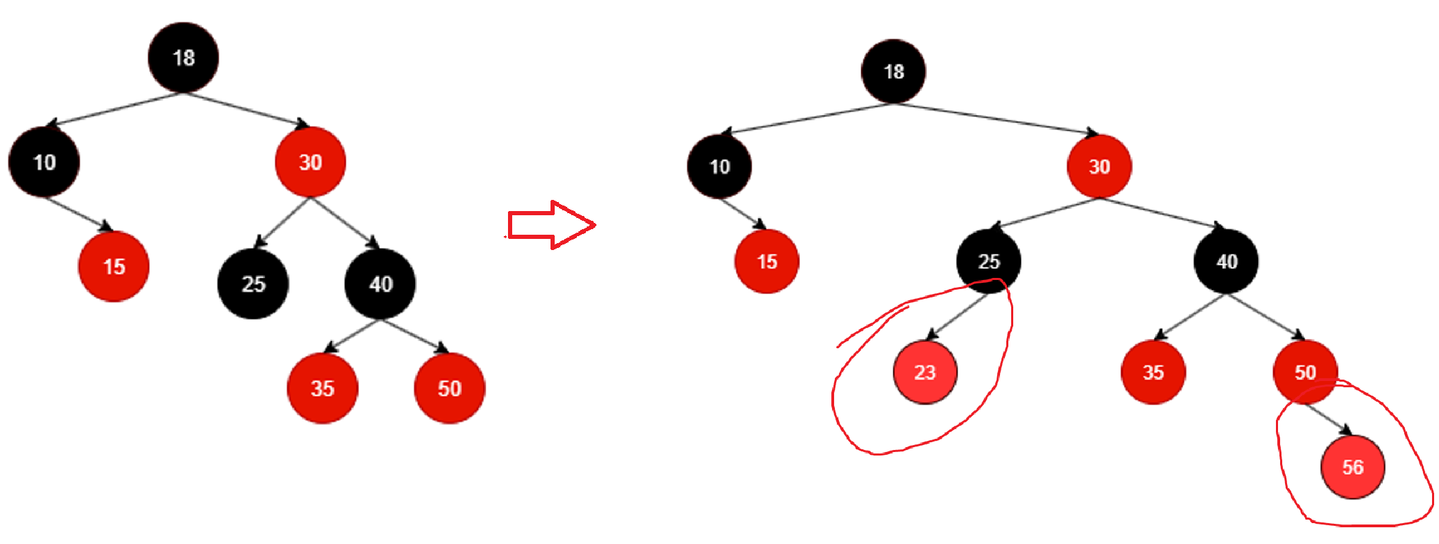插入23不犯啥毛病,插入56你可就是不懂事了,因为这样岂不是红-红,违反规则3了,但是这个插入只影响了: