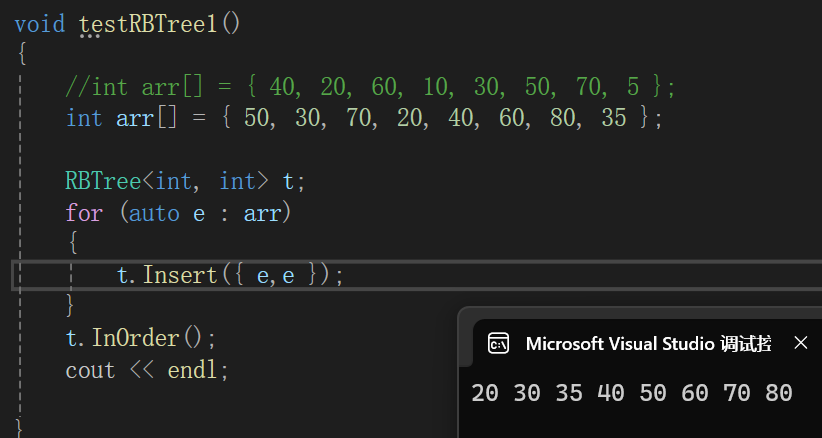bool Insert(const pair<K,V>& kv){if (_root == nullptr){_root = new Node(kv);_root->_color = BLACK;return true;}Node* cur = _root;Node* parent = nullptr;while (cur){if (kv.first < cur->_kv.first){parent = cur;cur = cur->_left;}else if (kv.first > cur->_kv.first){parent = cur;cur = cur->_right;}elsereturn false;}cur = new Node(kv);//新插入的结点颜色必定为红cur->_color = RED;if (cur->_kv.first < parent->_kv.first)parent->_left = cur;elseparent->_right = cur;while (parent&& parent->_color == RED)//p为黑c为红,不用继续调整了{//新插入结点必定是叶子结点//如果p是红,那么g一定存在且一定为黑//初始情况下是这样的情况//即使迭代起来也是 Node* grandfather = parent->_parent;Node* uncle = nullptr;//parent与uncle相对位置不知道,不能武断if (parent == grandfather->_left)// g// p uuncle = grandfather->_right;else// g// u puncle = grandfather->_left;//根据uncle分类讨论if (uncle&&uncle->_color == RED){parent->_color = BLACK;uncle->_color = BLACK;grandfather->_color = RED; // g(r)// p(b) u(b)// c(r)cur = grandfather;parent = cur->_parent;if (parent == nullptr)_root->_color = BLACK;}//else if(uncle == nullptr||uncle->_color == BLACK)else{//右单旋// g// p u//cif (grandfather->_left == parent && parent->_left == cur){RotateR(grandfather);parent->_color = BLACK;cur->_color = grandfather->_color = RED;}//左右双旋// g// p u// celse if (grandfather->_left == parent && parent->_right == cur){RotateLR(grandfather);cur->_color = BLACK;parent->_color = grandfather->_color = RED;}//左单旋// g// u p// celse if (grandfather->_right == parent && parent->_right == cur){RotateL(grandfather);parent->_color = BLACK;cur->_color = grandfather->_color = RED;}//右左双旋// g// u p// c//else if (grandfather->_right == parent && parent->_left == cur)else{RotateRL(grandfather);cur->_color = BLACK;parent->_color = grandfather->_color = RED;}cur = grandfather;parent = cur->_parent;break;} }return true;}