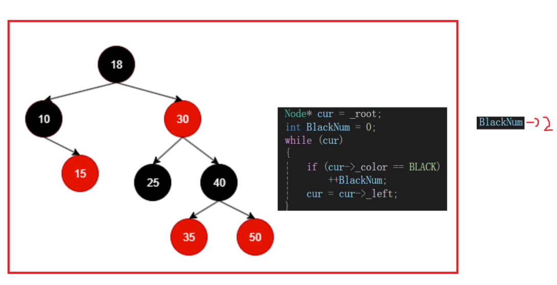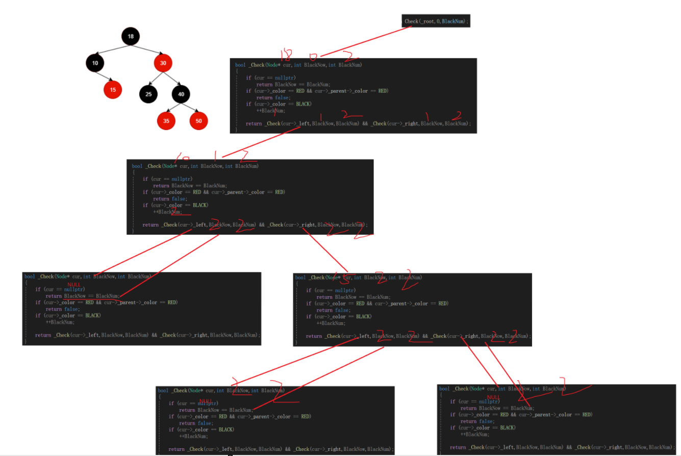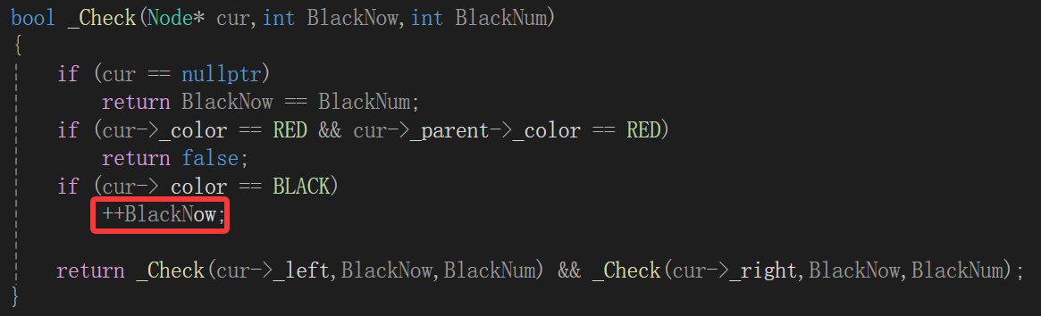 private:bool _Check(Node* cur,int BlackNow,int BlackNum){if (cur == nullptr)return BlackNow == BlackNum;if (cur->_color == RED && cur->_parent->_color == RED)return false;if (cur->_color == BLACK)++BlackNum;return _Check(cur->_left,BlackNow,BlackNum) && _Check(cur->_right,BlackNow,BlackNum);}