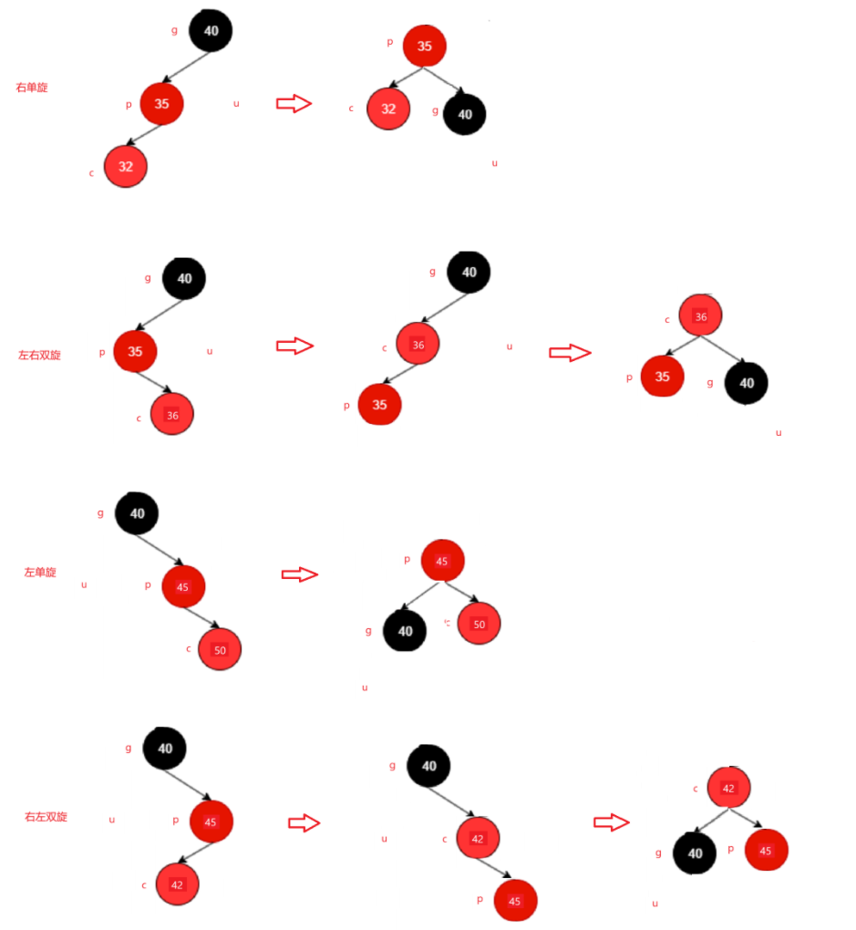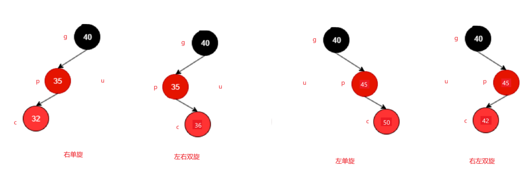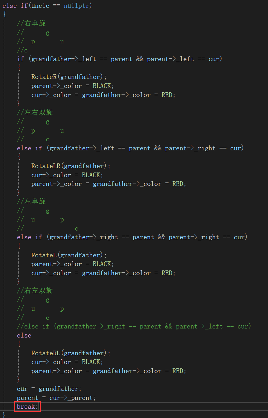 else if(uncle == nullptr){//右单旋// g// p u//cif (grandfather->_left == parent && parent->_left == cur){RotateR(grandfather);parent->_color = BLACK;cur->_color = grandfather->_color = RED;}//左右双旋// g// p u// celse if (grandfather->_left == parent && parent->_right == cur){RotateLR(grandfather);cur->_color = BLACK;parent->_color = grandfather->_color = RED;}//左单旋// g// u p// celse if (grandfather->_right == parent && parent->_right == cur){RotateL(grandfather);parent->_color = BLACK;cur->_color = grandfather->_color = RED;}//右左双旋// g// u p// c//else if (grandfather->_right == parent && parent->_left == cur)else{RotateRL(grandfather);cur->_color = BLACK;parent->_color = grandfather->_color = RED;}cur = grandfather;parent = cur->_parent;}
