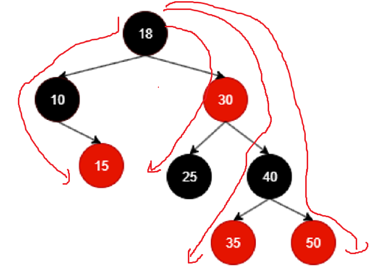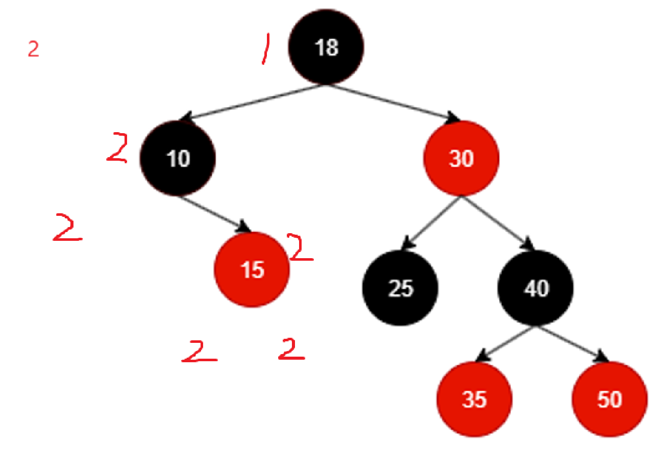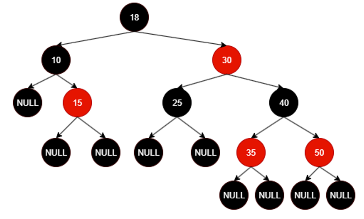 - 从任意一个结点出发到所有NULL结点的路径上黑色结点的数量相同