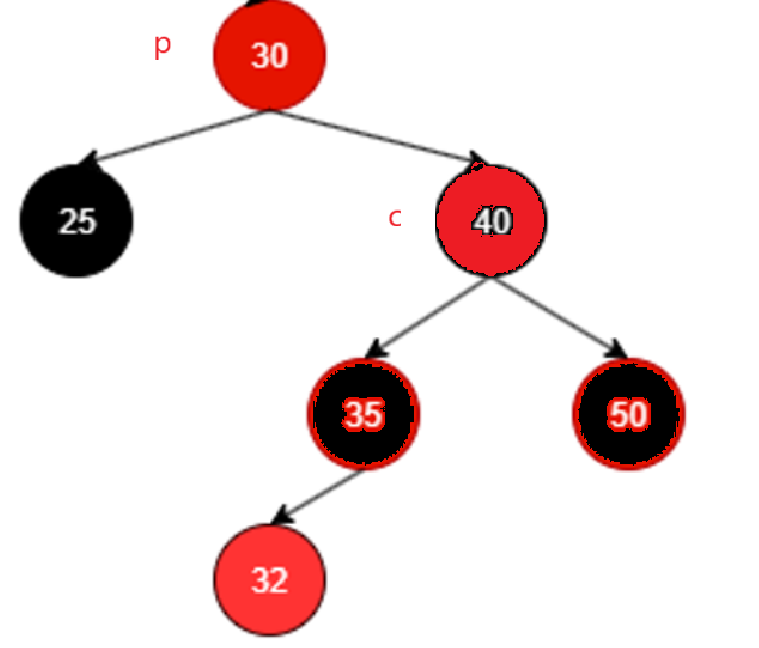 既然p-c是红-红,插入结点不是必须为红嘛,我们已经分析过了,所以p->黑: