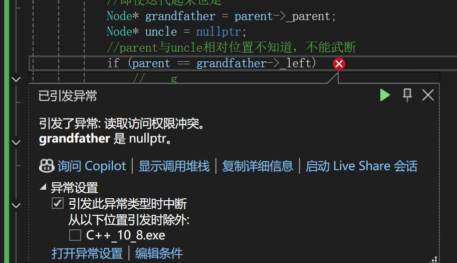 while (parent&& parent->_color == RED)//p为黑c为红,不用继续调整了{//新插入结点必定是叶子结点//如果p是红,那么g一定存在且一定为黑//初始情况下是这样的情况//即使迭代起来也是 Node* grandfather = parent->_parent;Node* uncle = nullptr;//parent与uncle相对位置不知道,不能武断if (parent == grandfather->_left)// g// p uuncle = grandfather->_right;else// g// u puncle = grandfather->_left;if (uncle->_color == RED){parent->_color = BLACK;uncle->_color = BLACK;grandfather->_color = RED; // g(r)// p(b) u(b)// c(r)cur = grandfather;parent = cur->_parent;if (parent == nullptr)_root->_color = BLACK;}}