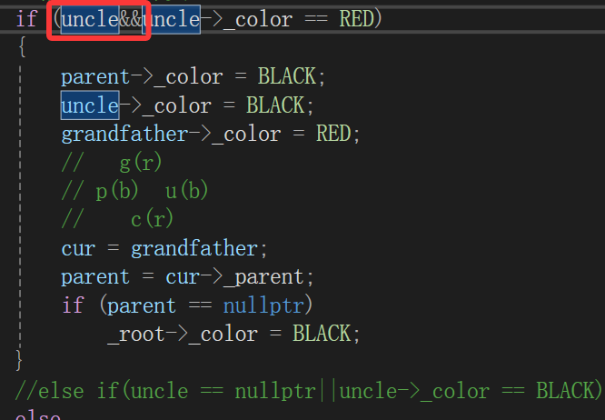 while (parent){//新插入结点必定是叶子结点//p为黑c为红,不用继续调整了if (parent->_color == BLACK)break;//如果p是红,那么g一定存在且一定为黑//初始情况下是这样的情况//即使迭代起来也是else if (parent->_color == RED){ Node* grandfather = parent->_parent;Node* uncle = nullptr;//parent与uncle相对位置不知道,不能武断if (parent == grandfather->_left)// g// p uuncle = grandfather->_right;else// g// u puncle = grandfather->_left;if (uncle->_color == RED){parent->_color = BLACK;uncle->_color = BLACK;grandfather->_color = RED; // g(r)// p(b) u(b)// c(r)cur = grandfather;parent = cur->_parent;if (parent == nullptr)_root->_color = BLACK;}}