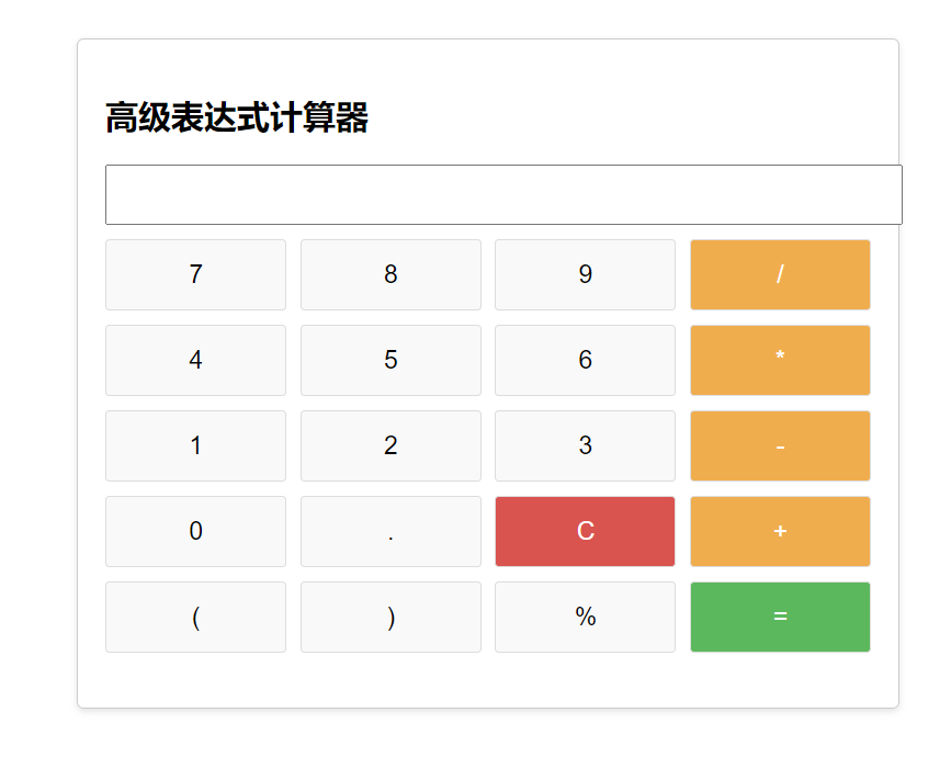 <head><!-- 字符编码声明,确保中文字符正确显示 --><meta charset="UTF-8"><!-- 视口设置,使网页在不同设备上都能正确缩放 --><meta name="viewport" content="width=device-width, initial-scale=1.0"><title>高级表达式计算器</title><style>body {/* 设置字体 */font-family: Arial, sans-serif;/*页面最大宽度*/max-width: 600px;/*上下外边距,左右自动居中*/margin: 50px auto;/*内边距*/padding: 20px;}/*计算机容器的样式*/.calculator {/*边框样式*/border: 1px solid #ccc;/*设置内边距*/padding: 20px;/*边框圆角*/border-radius: 5px;/*阴影效果*/box-shadow: 0 2px 5px rgba(0,0,0,0.1);}/*输入框样式*/input[type="text"] {/*宽度*/width: 100%;/*内边距*/padding: 10px;/*底部外边距*/margin-bottom: 10px;/*字体大小*/font-size: 18px;/*文本右对齐*/text-align: right;}/*按钮样式*/.buttons {/*使用网格布局*/display: grid;/*4列等宽网格*/grid-template-columns: repeat(4, 1fr);/*网格间隙*/gap: 10px;}/*按钮基本样式*/button {/*内部边距*/padding: 15px;/*字体大小*/font-size: 18px;/*边框样式*/border: 1px solid #ddd;/*边框圆角*/border-radius: 3px;/*背景颜色*/background: #f9f9f9;/*鼠标指针样式为手型*/cursor: pointer;}/*鼠标悬浮时按钮样式*/button:hover {/*背景颜色*/background: #eee;}/*操作符按钮的特殊样式*/.operator {/*背景颜色*/background: #f0ad4e;/*文字颜色*/color: white;}/*等号按钮的特殊样式*/.equals {/*背景颜色*/background: #5cb85c;/*文字颜色*/color: white;}/*清楚按钮的特殊样式*/.clear {/*背景颜色*/background: #d9534f;/*文字颜色*/color: white;}</style>