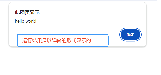 <!--结合方式1:在页面上使用script标签,在标签中书写js代码--><!--书写的内容是文本类型,属于js语言--><script type="text/javascript">alert("hello world!")</script>