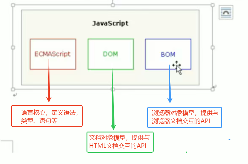 - ECMAScript:语言核心,定义语法、类型、语句等