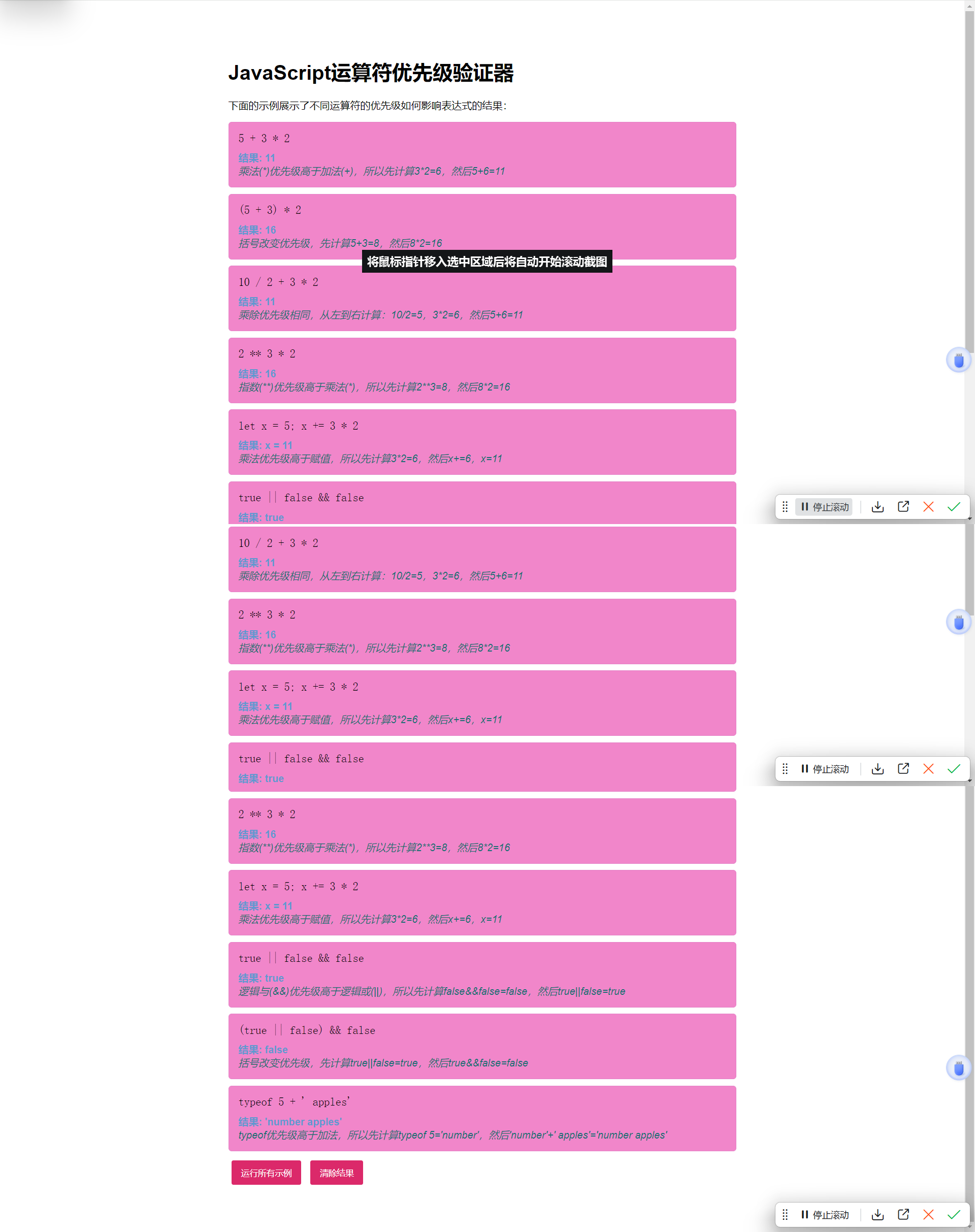 <body><h1>JavaScript运算符优先级验证器</h1><p>下面的示例展示了不同运算符的优先级如何影响表达式的结果:</p><div class="example"><div class="expression">5 + 3 * 2</div><div class="result" id="result1"></div><div class="explanation">乘法(*)优先级高于加法(+),所以先计算3*2=6,然后5+6=11</div></div><div class="example"><div class="expression">(5 + 3) * 2</div><div class="result" id="result2"></div><div class="explanation">括号改变优先级,先计算5+3=8,然后8*2=16</div></div><div class="example"><div class="expression">10 / 2 + 3 * 2</div><div class="result" id="result3"></div><div class="explanation">乘除优先级相同,从左到右计算:10/2=5,3*2=6,然后5+6=11</div></div><div class="example"><div class="expression">2 ** 3 * 2</div><div class="result" id="result4"></div><div class="explanation">指数(**)优先级高于乘法(*),所以先计算2**3=8,然后8*2=16</div></div><div class="example"><div class="expression">let x = 5; x += 3 * 2</div><div class="result" id="result5"></div><div class="explanation">乘法优先级高于赋值,所以先计算3*2=6,然后x+=6,x=11</div></div><div class="example"><div class="expression">true || false && false</div><div class="result" id="result6"></div><div class="explanation">逻辑与(&&)优先级高于逻辑或(||),所以先计算false&&false=false,然后true||false=true</div></div><div class="example"><div class="expression">(true || false) && false</div><div class="result" id="result7"></div><div class="explanation">括号改变优先级,先计算true||false=true,然后true&&false=false</div></div><div class="example"><div class="expression">typeof 5 + ' apples'</div><div class="result" id="result8"></div><div class="explanation">typeof优先级高于加法,所以先计算typeof 5='number',然后'number'+' apples'='number apples'</div></div><button onclick="runAllExamples()">运行所有示例</button><button onclick="clearAllResults()">清除结果</button><script>function runAllExamples() {// 示例1document.getElementById('result1').textContent = `结果: ${5 + 3 * 2}`;// 示例2document.getElementById('result2').textContent = `结果: ${(5 + 3) * 2}`;// 示例3document.getElementById('result3').textContent = `结果: ${10 / 2 + 3 * 2}`;// 示例4document.getElementById('result4').textContent = `结果: ${2 ** 3 * 2}`;// 示例5let x = 5;x += 3 * 2;document.getElementById('result5').textContent = `结果: x = ${x}`;// 示例6document.getElementById('result6').textContent = `结果: ${true || false && false}`;// 示例7document.getElementById('result7').textContent = `结果: ${(true || false) && false}`;// 示例8document.getElementById('result8').textContent = `结果: '${typeof 5 + ' apples'}'`;}function clearAllResults() {for (let i = 1; i <= 8; i++) {document.getElementById('result' + i).textContent = '';}}// 页面加载时自动运行示例window.onload = runAllExamples;</script>