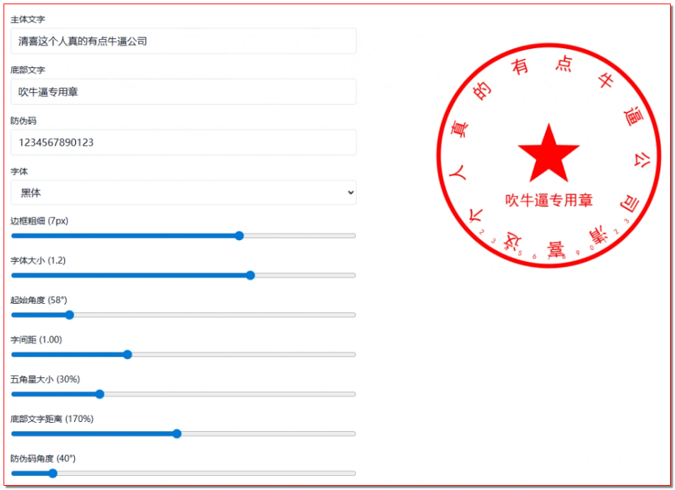 使用该工具的操作流程十分简洁,第一步是进入工具界面,通过浏览器打开工具后,无需登录或填写个人信息,直接进入印章编辑页面。页面布局清晰,左侧为参数设置区域,可直接输入印章核心文字,包括主体名称(如企业名称、个人专属标识)和底部辅助文字(如 “合同专用章”“报告确认章” 等),文字输入后可实时在右侧预览区查看效果。