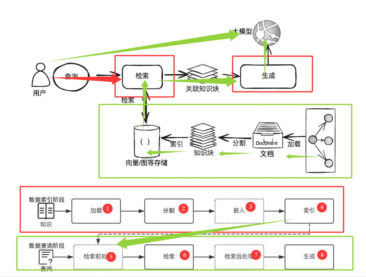 底部的 “知识→加载→分割→嵌入→索引” 和 “查询→检索前处理→检索→检索后处理→生成”:是对 “数据索引” 和 “数据查询” 阶段的详细步骤拆解,让流程更清晰。