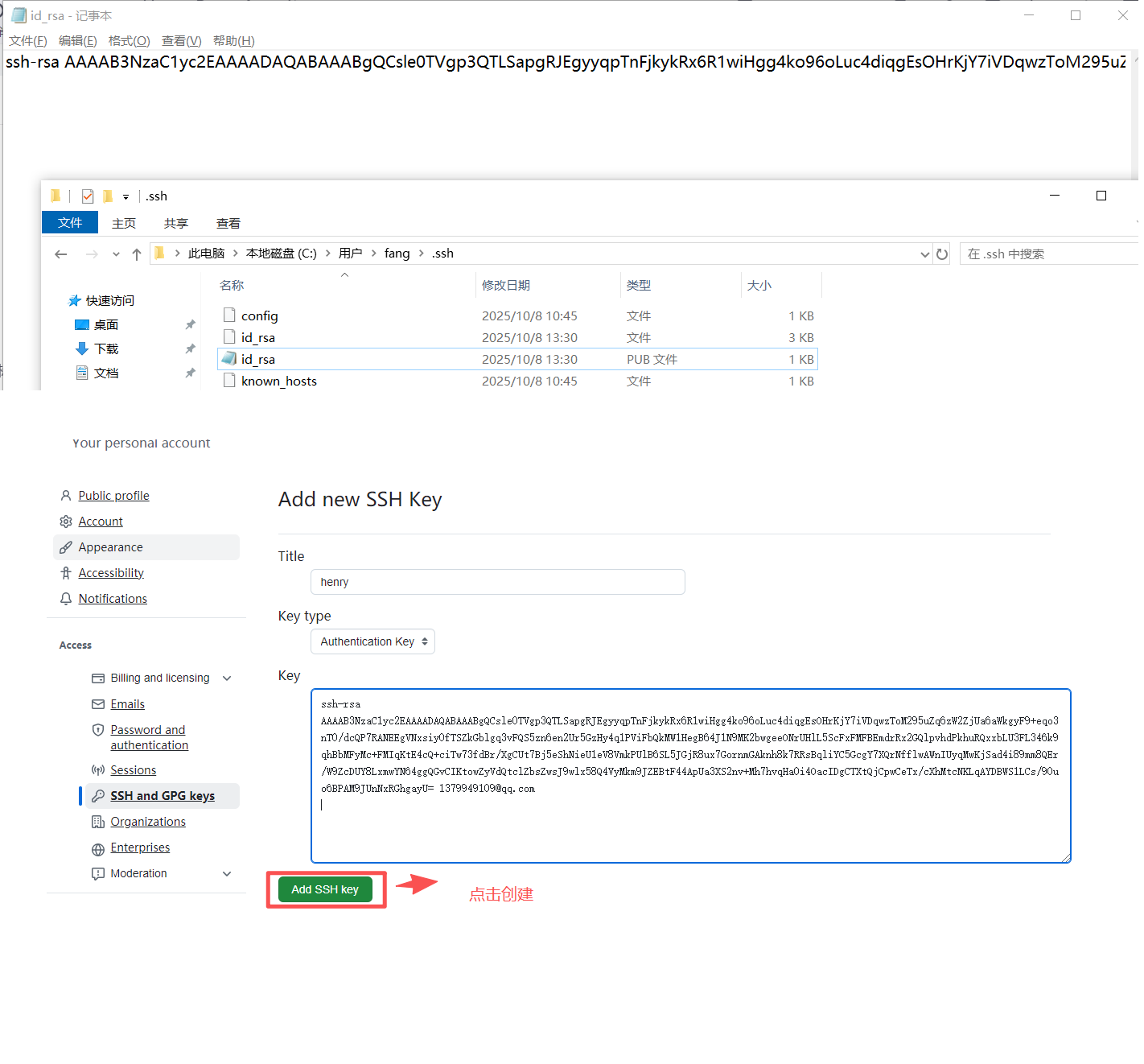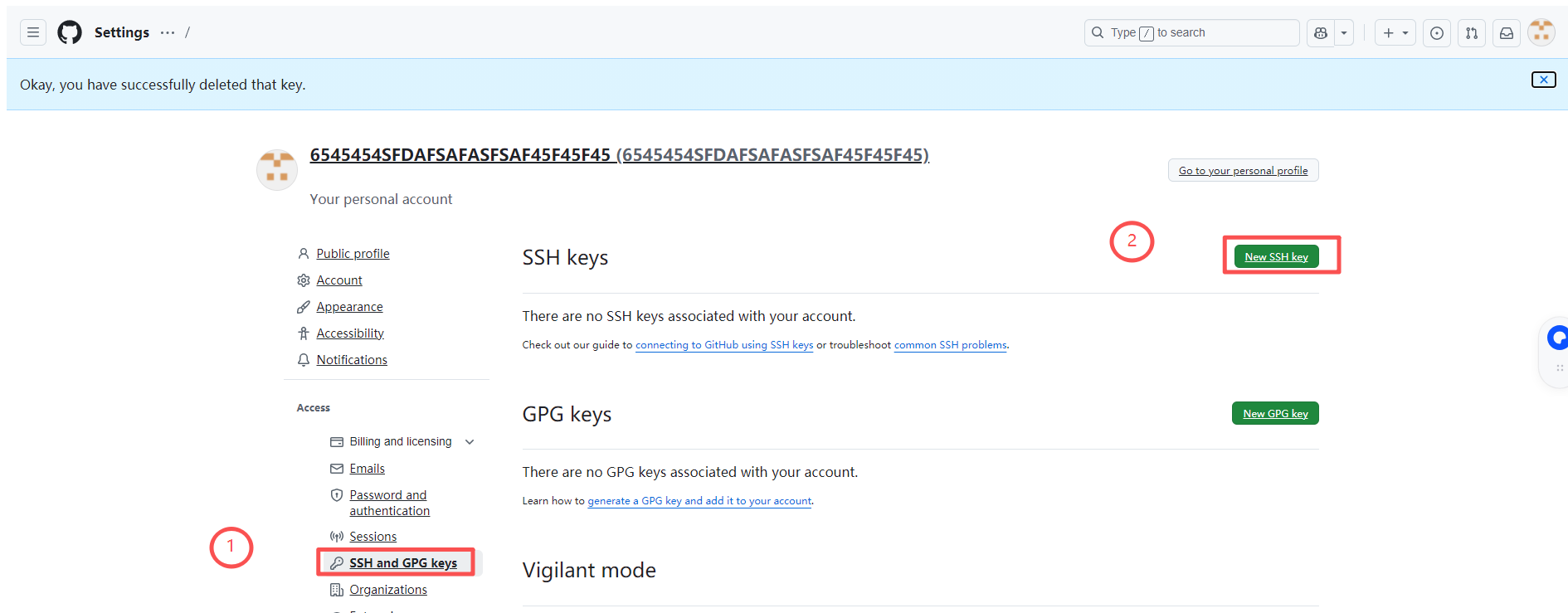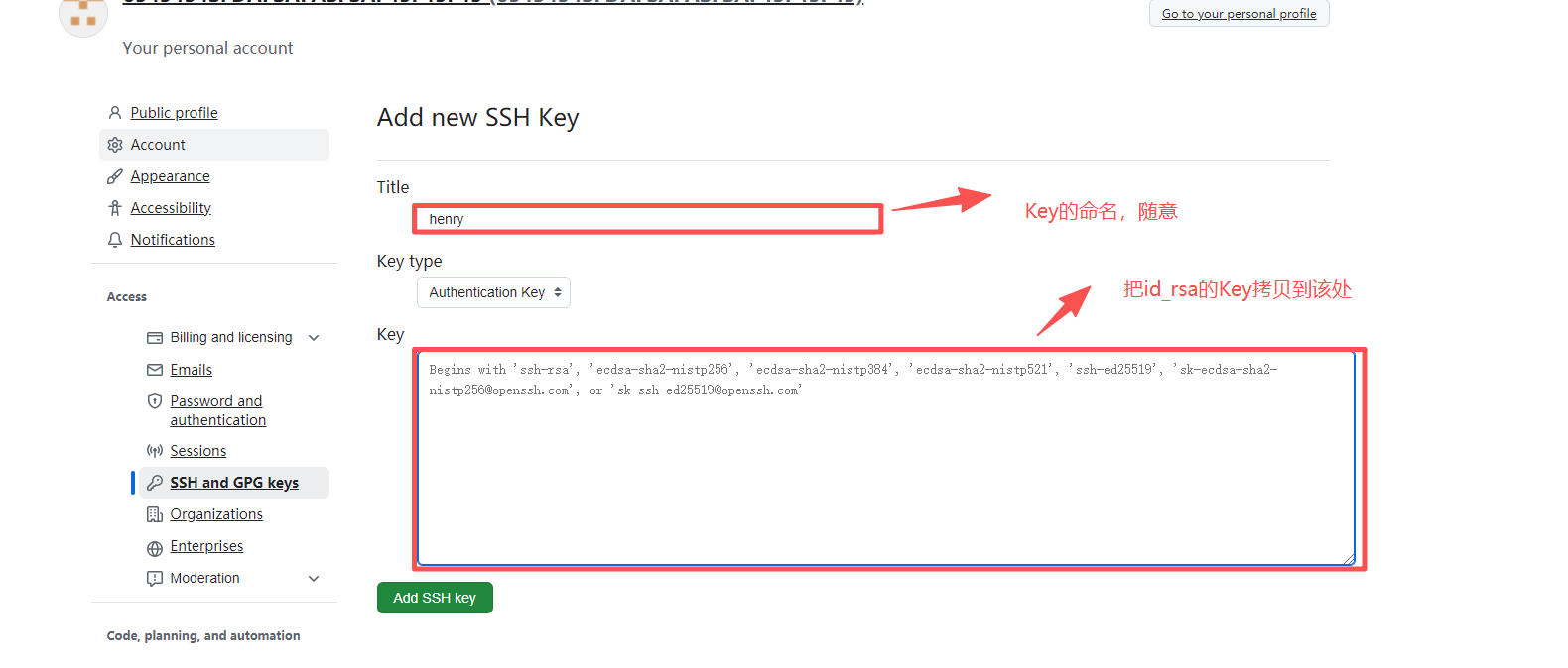 3.Github上需要配置ssh,点击个人头像,然后点击setting,并添加SSH Key